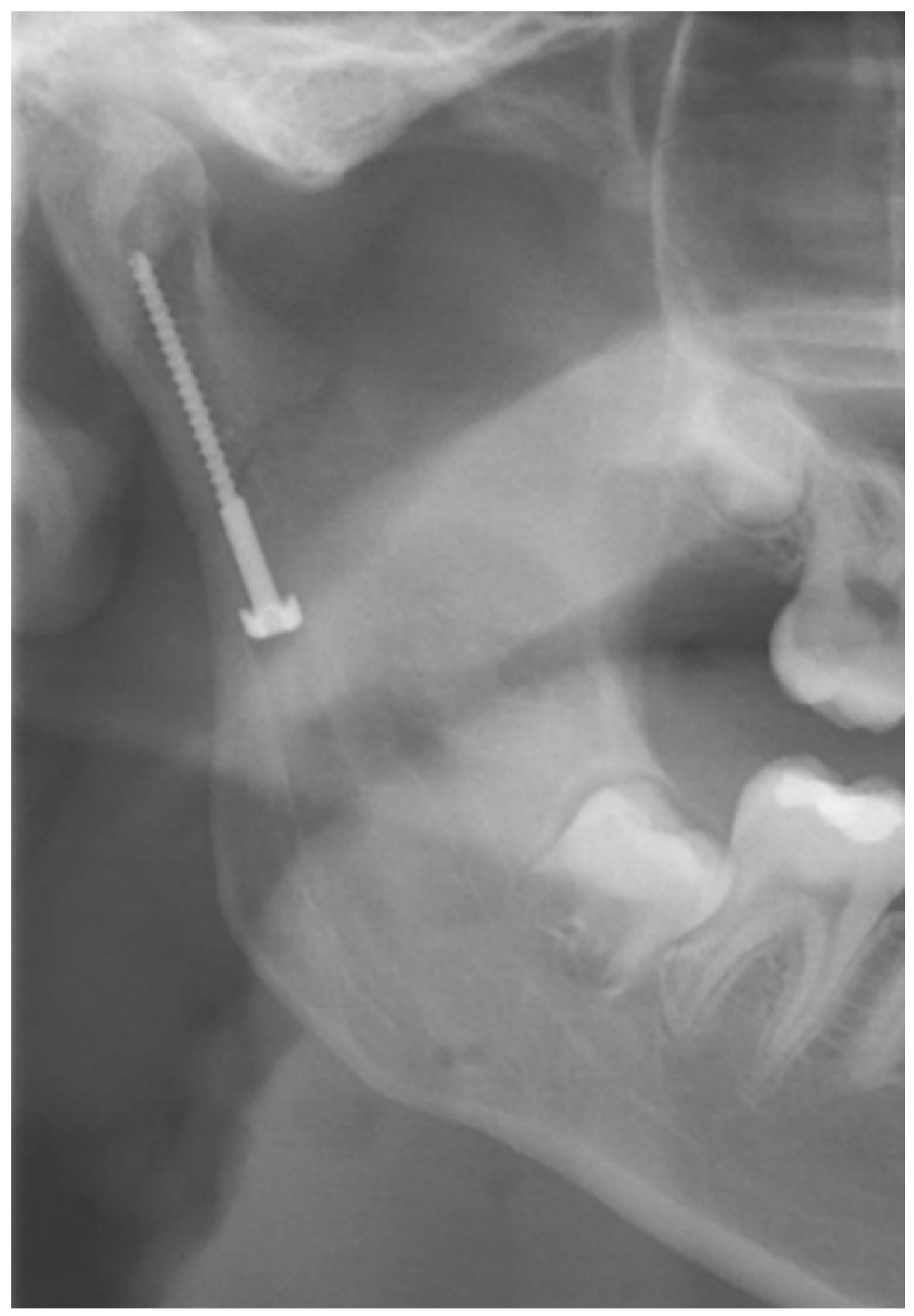 Two operations had to be redone because of inadequate reposition in the symphysis/parasymphysis with broad (>2 mm) lingual splay. In both cases, straight miniplates were removed. Osteosynthesis was achieved with lag screws.