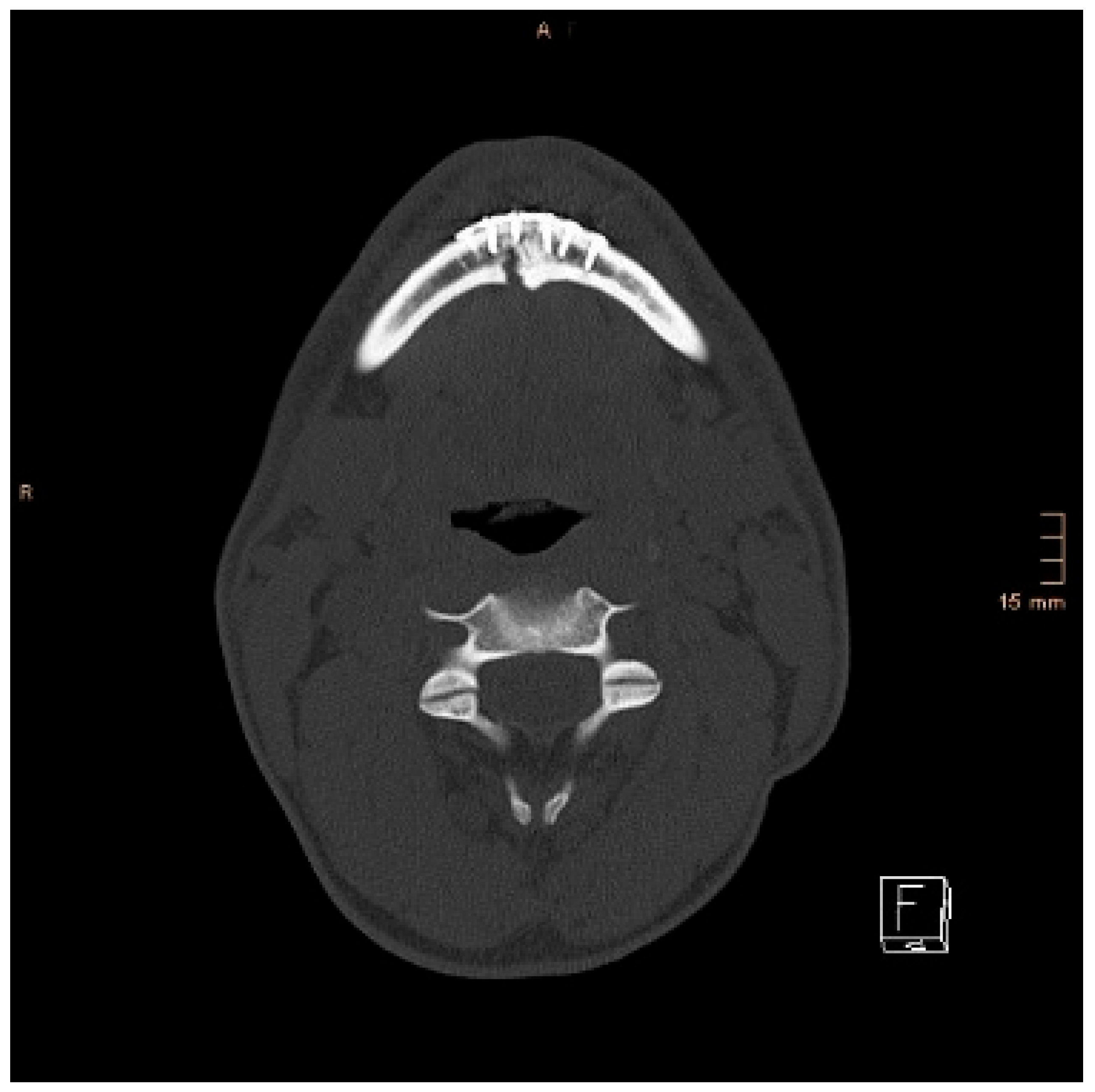 The presence of a gap at the lingual aspect (“lingual splaying”) in the symphysis/parasymphysis area or body after ORIF on the axial view of a CT scan. Less than 1 mm on the axial view was considered acceptable, and more than 1 mm was considered insufficient. When symphyseal/parasymphyseal or body fractures are plated with the buccal borders in contact, but the lingual borders separated (“lingual splaying”), the mandible “opens” similarly to a book with an increase in the intergonial distance and a broadening of the face. Some authors describe this phenomenon as a “widening of the mandible,” and it happens in the presence of a concomitant monolateral or bilateral condylar fracture (