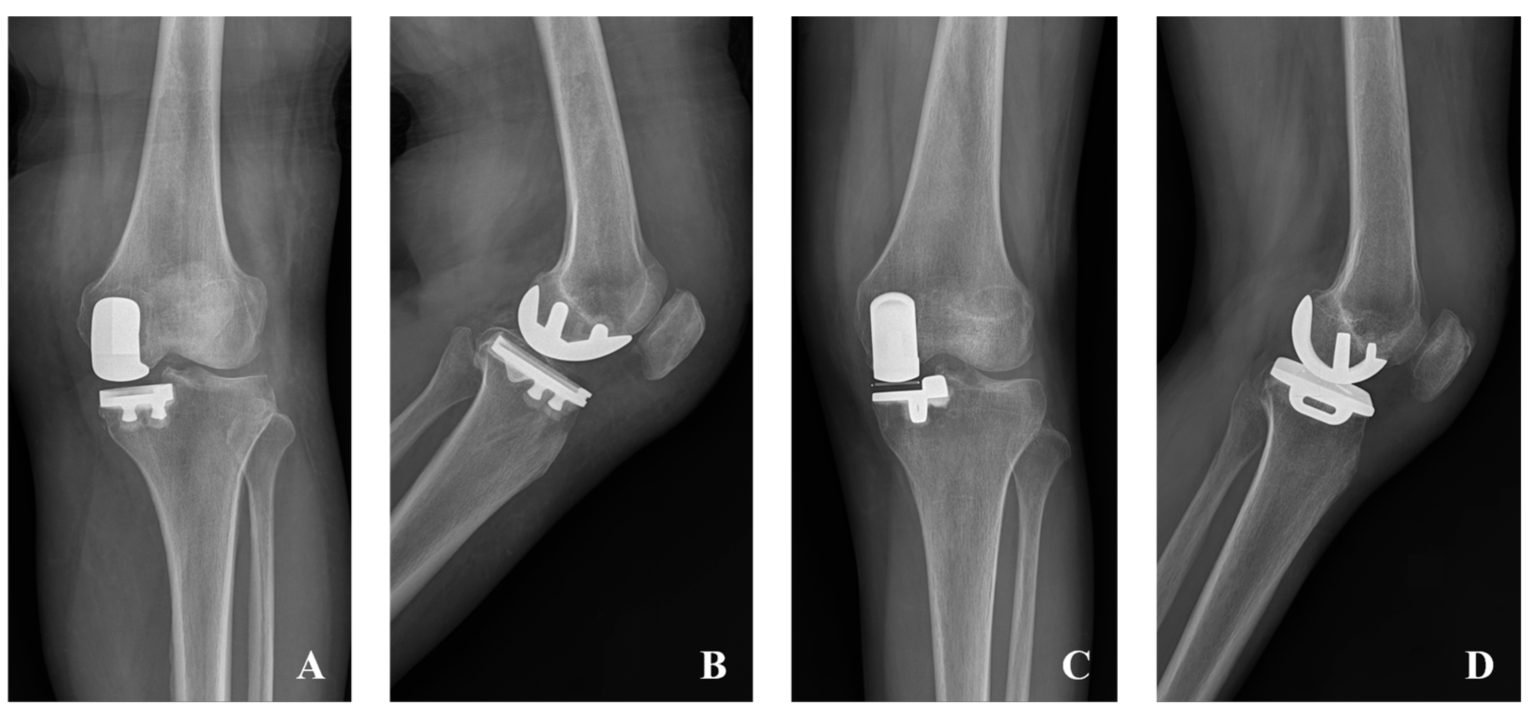 - Tay, M.L.; Bolam, S.M.; Maxwell, A.R.; Hooper, G.J.; Monk, A.P.; Young, S.W. Similar Survivorship but Different Revision Reasons for Uncemented Mobile-Bearing and Cemented Fixed-Bearing Medial UKA: A Long-Term Population-Based Cohort Study of 2015 Patients. J. Bone Jt. Surg. Am. 2023, 105, 755–761. [Google Scholar] [CrossRef] [PubMed]