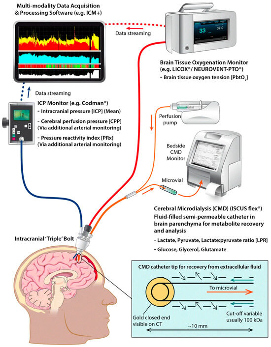 - Stovell, M.G.; Helmy, A.; Thelin, E.P.; Jalloh, I.; Hutchinson, P.J.; Carpenter, K.L.H. An overview of clinical cerebral microdialysis in acute brain injury. Front. Neurol. 2023, 14, 1085540. [Google Scholar] [CrossRef]