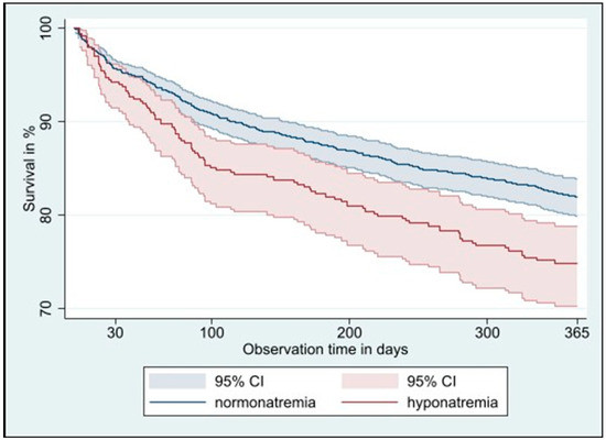 Kaplan–Meier 1-year survival curve in multimorbid older adults with normonatremia versus hyponatremia at hospital admission. Abbreviations: CI: confidence interval.