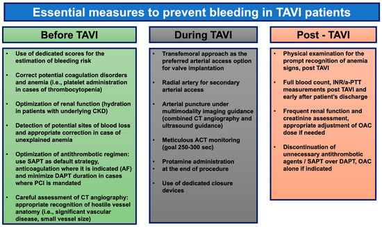 The close monitoring of the patient based on (1) their history, with specific questions made about the presence of blood in their urine/stools, (2) a physical examination focused on the recognition of symptoms/signs of anemia, and (3) lab tests (full blood count, INR, a-PPT, and creatinine levels so as to adjust the dose or even change/halt anticoagulant agents based on the EGFR when indicated) should be continued after the completion of TAVI during the hospital stay and on subsequent follow-up visits for the prompt recognition and management of bleeding complications. The careful review of a patient’s medication is crucial in order to halt any unnecessary antithrombotic agents. The preventive measures are outlined in Figure 2.