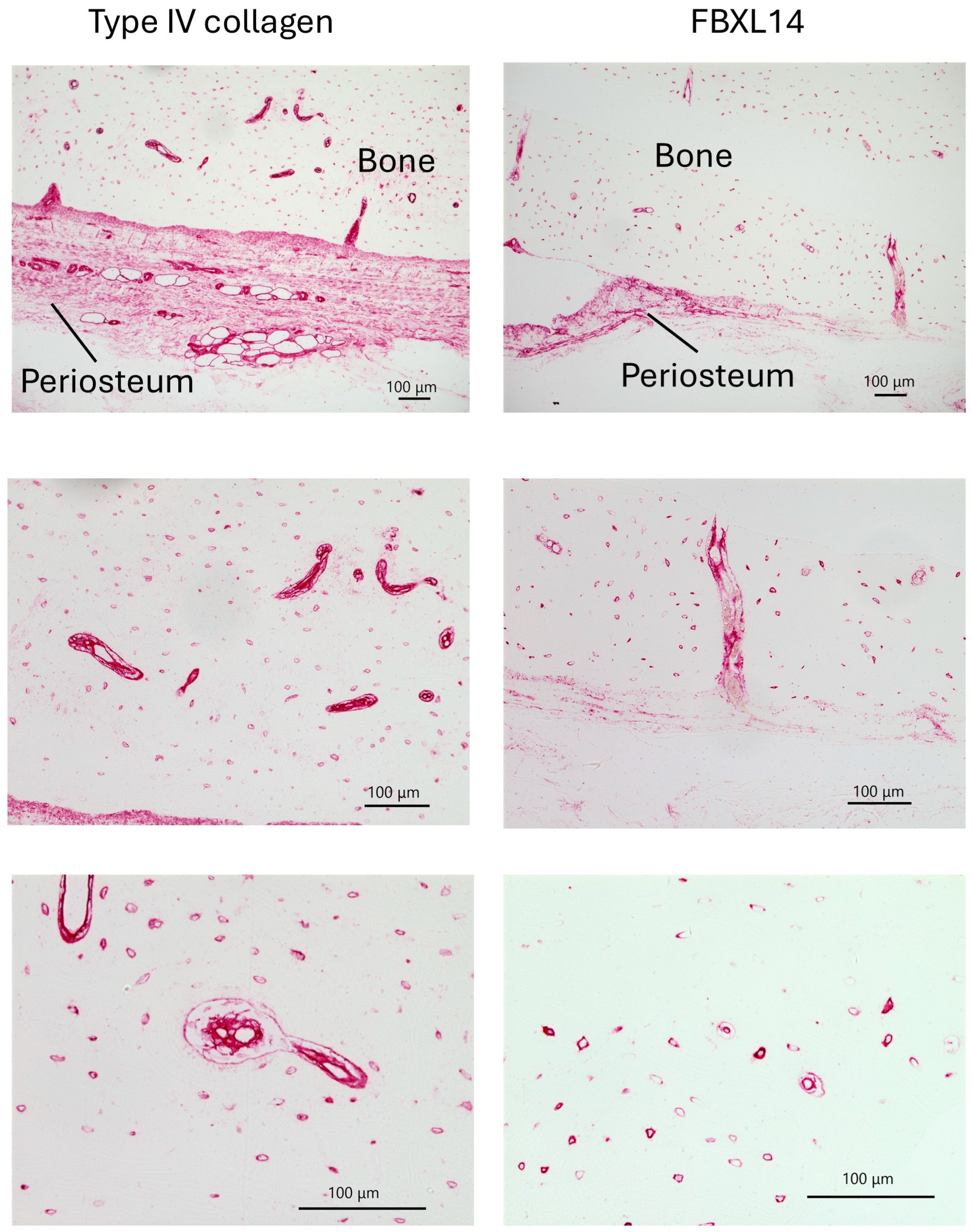 Type IV collagen and FBXL14 were expressed in the periosteum (Figure 3). In bone, type IV collagen and FBXL14 were expressed in Volkmann’s and Haversian canals. Expression of FBXL14 in Volkmann’s canals containing erythrocytes indicated the presence of FBXL14 in the capillaries (Figure 3, right, middle). However, in comparison with FBXL14, type IV collagen was expressed more extensively and strongly in capillaries because it was more abundant (Figure 3, middle, bottom).