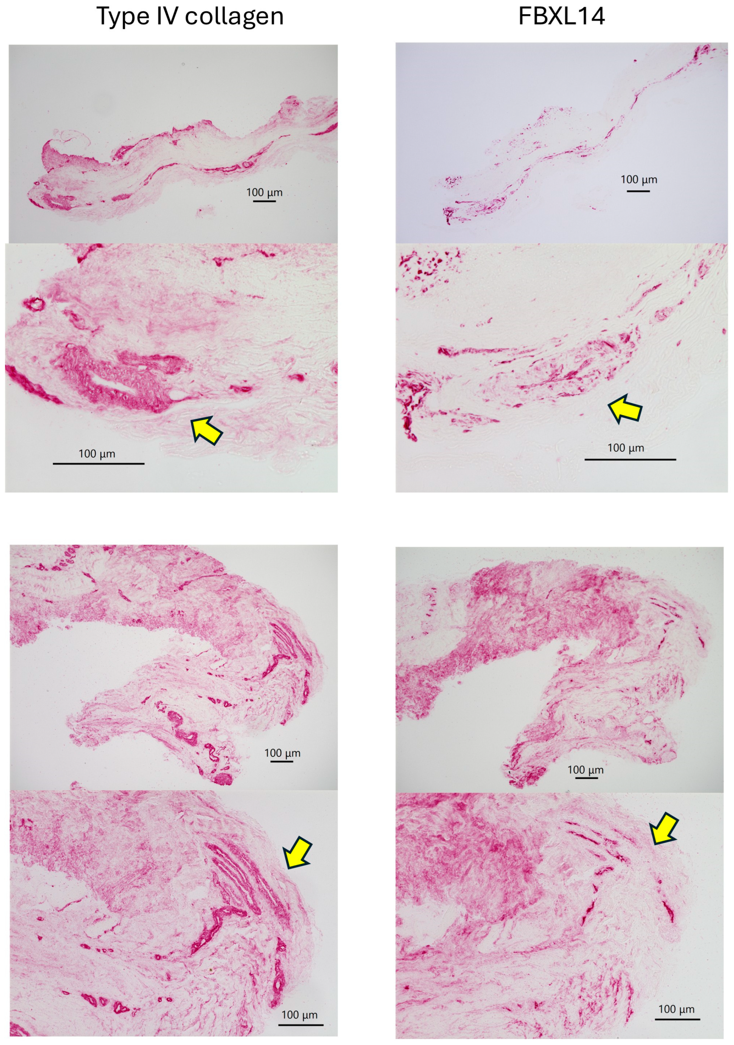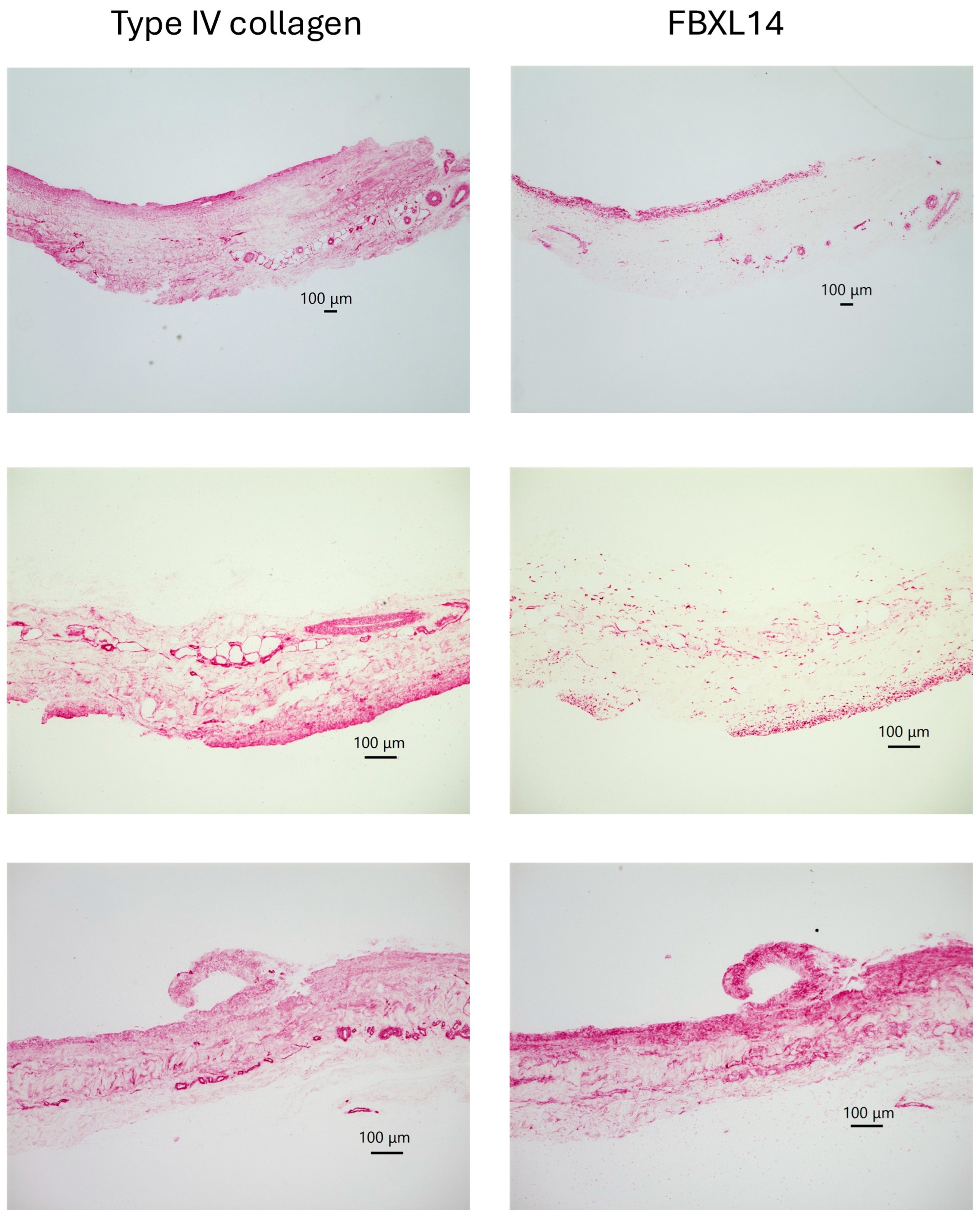 In accordance with datasets from ESI-Q-Orbitrap MS (JPST003206, JPST003258) in jPOSTrepo (Japan ProteOme STandard Repository), the presence of type IV collagen was suggested [28]. The activity of antigens in sections was retrieved using Proteinase K (Dako Cytomation, Glostrup, Denmark) for 10 min at room temperature. Anti-collagen Type IV (rabbit) antibody-600-401-1065 (1:500, 1 h; Rockland Immunochemicals, Inc., Rockland County, NY, USA) and anti-FBXL14 (rabbit) antibody (1:500 4 h; #SAB2103691; Sigma-Aldrich, Saint Louis, MO, USA) were used as the primary antibodies. Anti-EXOSC9 (1:500, 4 h; H-300; #sc-135118; Santa Cruz Biotechnology, Inc., Santa Cruz, CA, USA) (rabbit) antibody was used as the negative control. Alkaline phosphatase-conjugated goat anti-rabbit IgG(H+L) (1:200, 1 h; Proteintech Group, Inc., Rosemont, IL, USA) was used as the secondary antibody. All sections were visualized using PermaRed/AP (K049; Diagnostic BioSystems, Pleasanton, CA, USA). Images were obtained using a BZ-X810 microscope (Keyence Japan, Osaka, Japan) and X800 Viewer (Keyence). X800 Analyzer software (Keyence) was used to insert scale bars and increase the contrast. All images are preserved at the repository site GakuNin RDM (https://rdm.nii.ac.jp/)