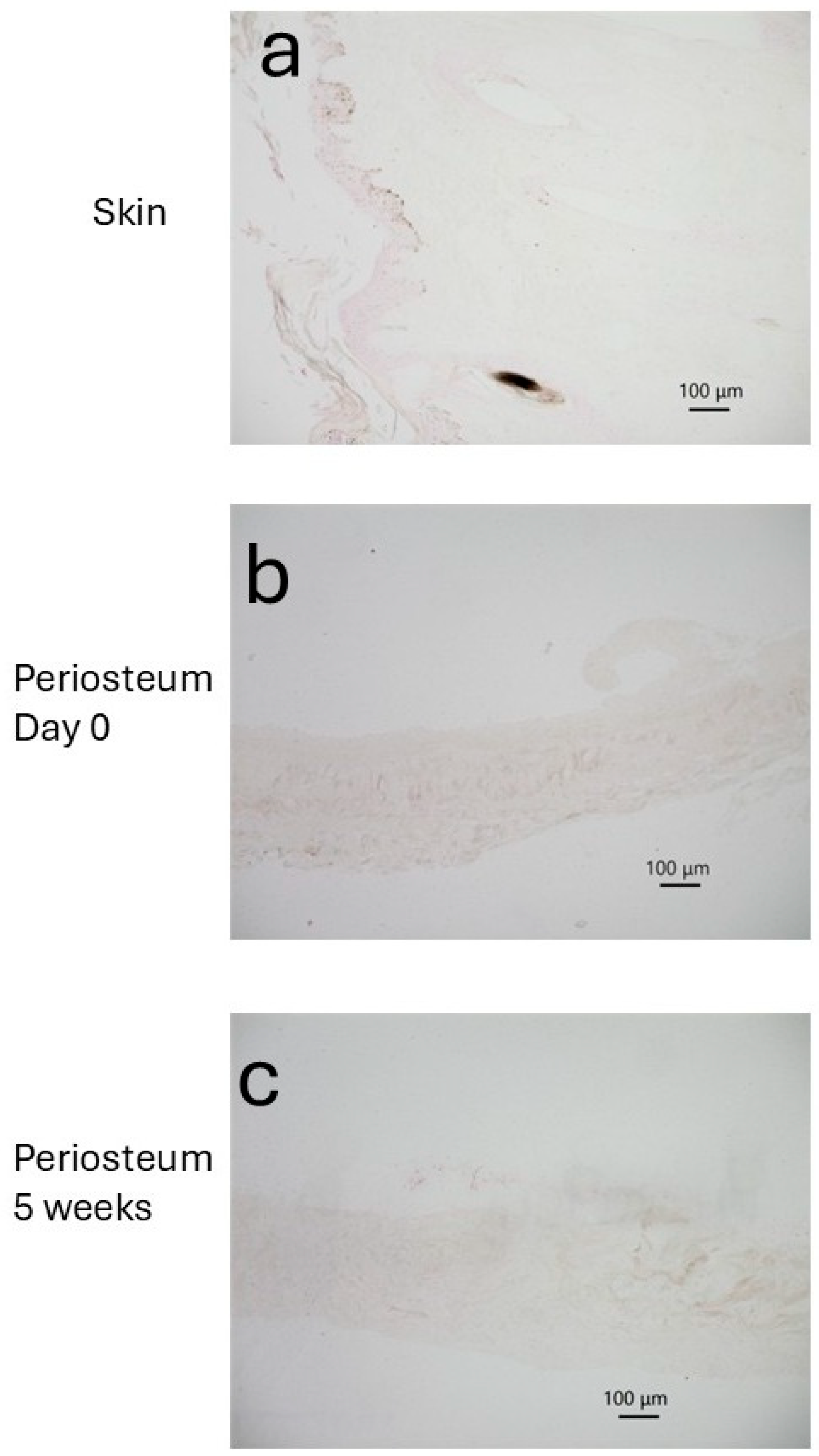 Figure 11. Negative controls: (a) Skin; (b) Periosteum on day 0; (c) Periosteum at 5 weeks.