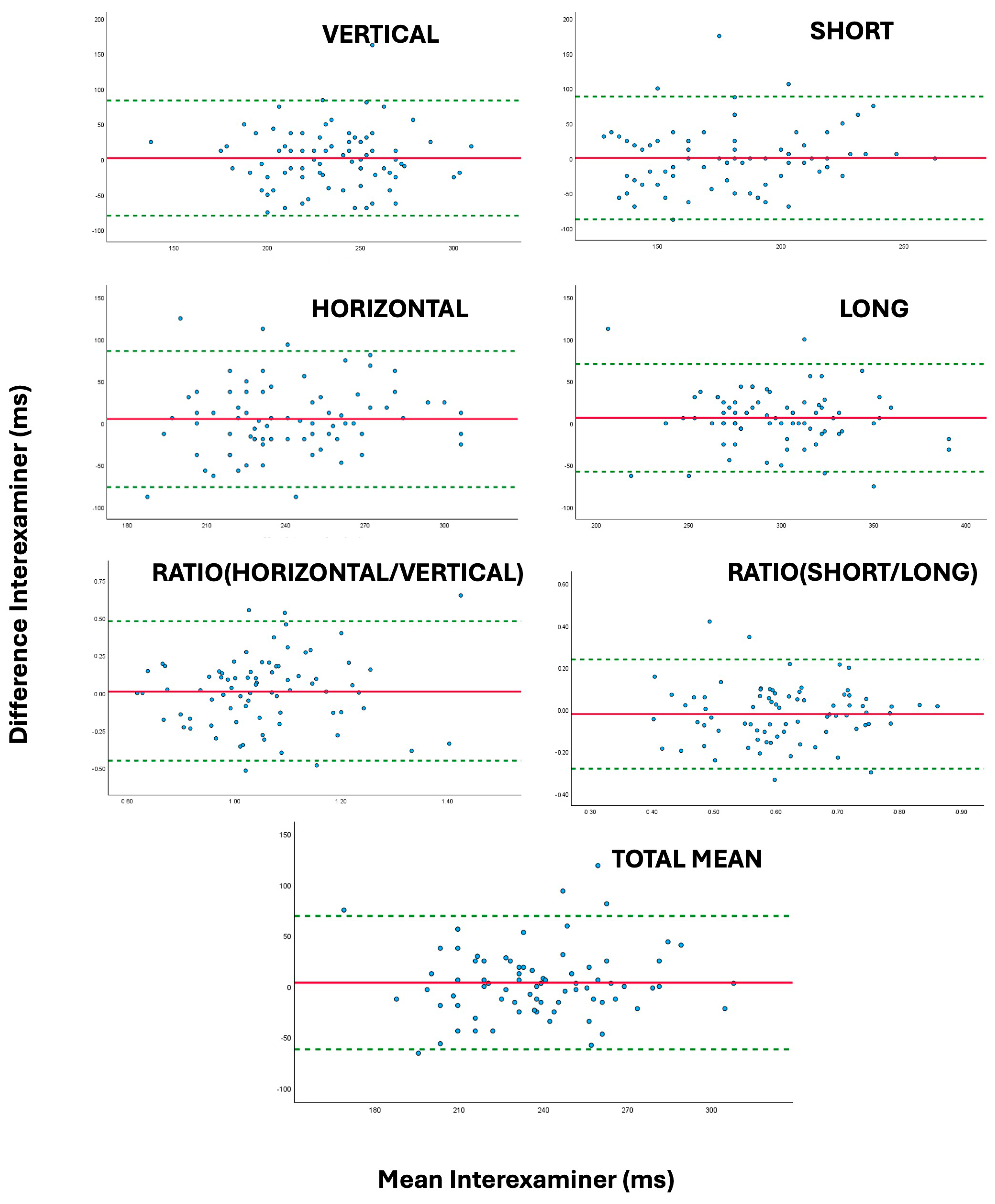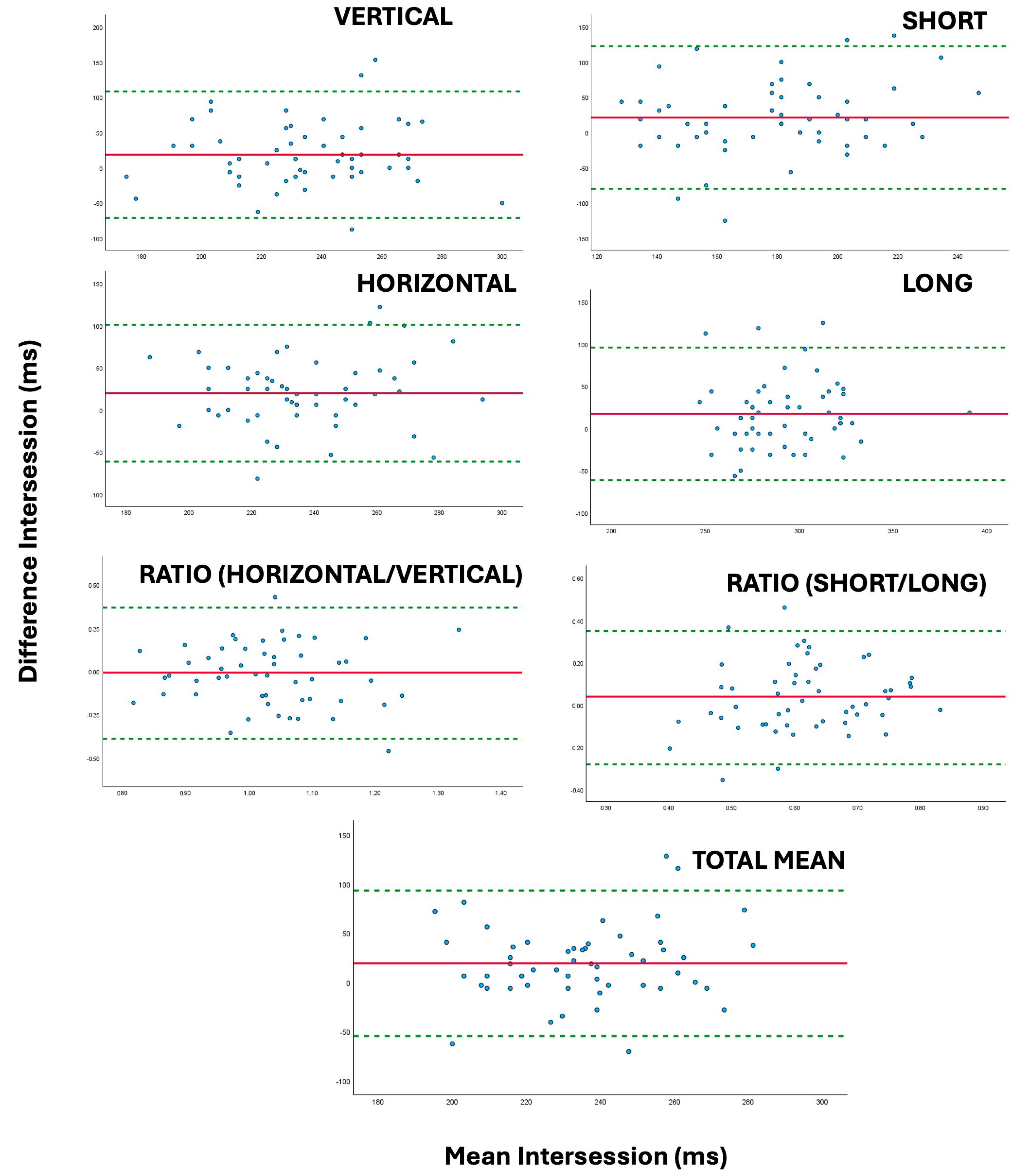 The main importance of this study lies in the moderate repeatability of saccadic duration measurements, using COI-SV® software, suggesting that the test can be reliably administered by any examiner. Regarding specific measures, 6 out of 8 ICC values demonstrated moderate to good reliability, although the lower limit of agreements indicated poor reliability (<0.400) in 7 out of 8 ICC values. Importantly, some ICC confidence intervals included negative lower bounds, which indicate extremely poor reliability and further highlight the limitations of the method. Additionally, the Bland–Altman analysis showed limits of agreement ranging from −159.0 to 220.3 ms for specific measures and from −87.0 to 122.52 ms for general measures (Table 1 and Table 2). These correspond to interval widths of 201.2 to 379.3 ms for specific values and 128.2 to 202.35 ms for general values. However, the wide dispersion of these limits (up to ±220 ms) also suggests substantial variability, which restricts their direct applicability in clinical decision-making and should be interpreted with caution.