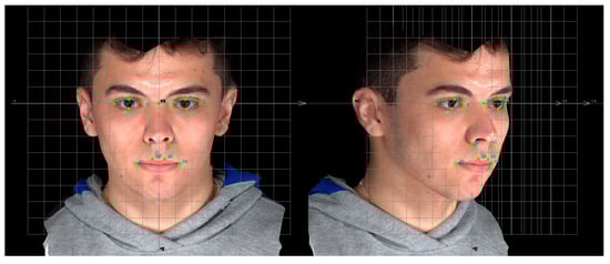 This study utilized 3D facial photographs obtained by the Vectra® M3 imaging system (Canfield Scientific, Fairfield, NJ, USA), comprising a 3D stereophotogrammetric camera setup for each patient. The system has been previously validated for clinical applications [] and applied in the context of the study of facial asymmetry []. The camera setup comprises three pods, each equipped with two digital cameras and a light flash, with the center pod featuring a small mirror. All the photographs were taken with the participants in repose, maintaining a neutral facial expression and eyes open. The images were captured in the natural head position, with patients being asked to swallow and maintain occlusion of their molars while observing themselves in the mirror to achieve habitual occlusion. Participants were required to remove their glasses, pull their hair away from their faces, sit and stay still during the photo acquisition. Additionally, participants were instructed to remove makeup, and individuals with dense facial hair were excluded. Following photographic image capture, achieved within milliseconds, the software program VECTRA® 3D Analysis Module (VAM version 6.2.3) was used to process a composite 3D surface image. The criteria for acceptable 3D facial surface images included valid representation of facial morphology, high scan resolution, absence of noticeable motion artifacts, and a closed mouth unless lips were naturally incompetent. To ensure measurement accuracy, the Vectra® M3 imaging system was calibrated on a monthly basis, following the manufacturer’s recommended calibration procedures. Figure 1 shows that the system can faithfully replicate the facial surface geometry while accurately applying lifelike color and texture data to the geometric shape, resulting in a realistic rendering.