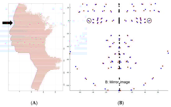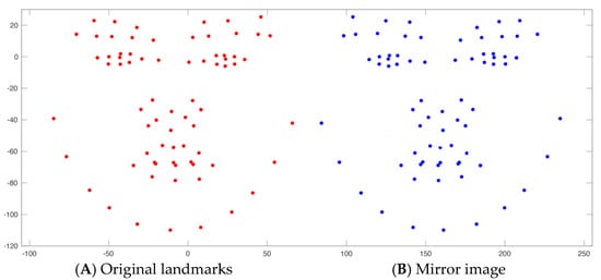 (A) Depicts the original facial landmarks (N = 115) projected onto the cloud model of the image. (B) The same facial landmarks were duplicated and mirrored along the Y-axis, creating mirror images for all landmarks.