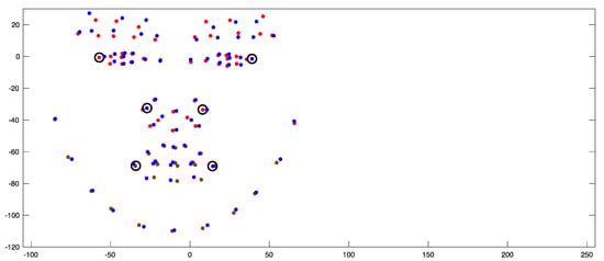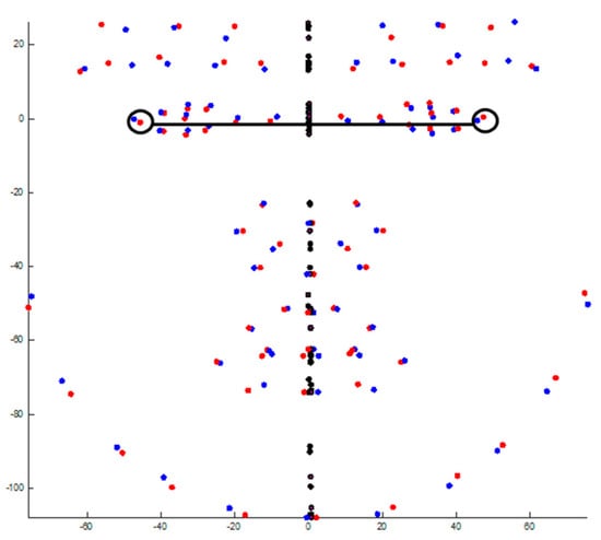 Alignment process between original (red) and mirror-imaged (blue) faces. The Black circles show some of the bilateral landmarks used in the alignment process.