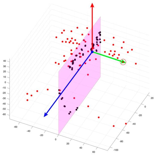 Determination of axes and planes in facial orientation. The red vector represents the negative direction of the YZ-axis. The green vector signifies the negative direction of the XY-axis. The blue vector illustrates the established coronal plane (XZ) derived from the cross product of the YZ and XY axes.