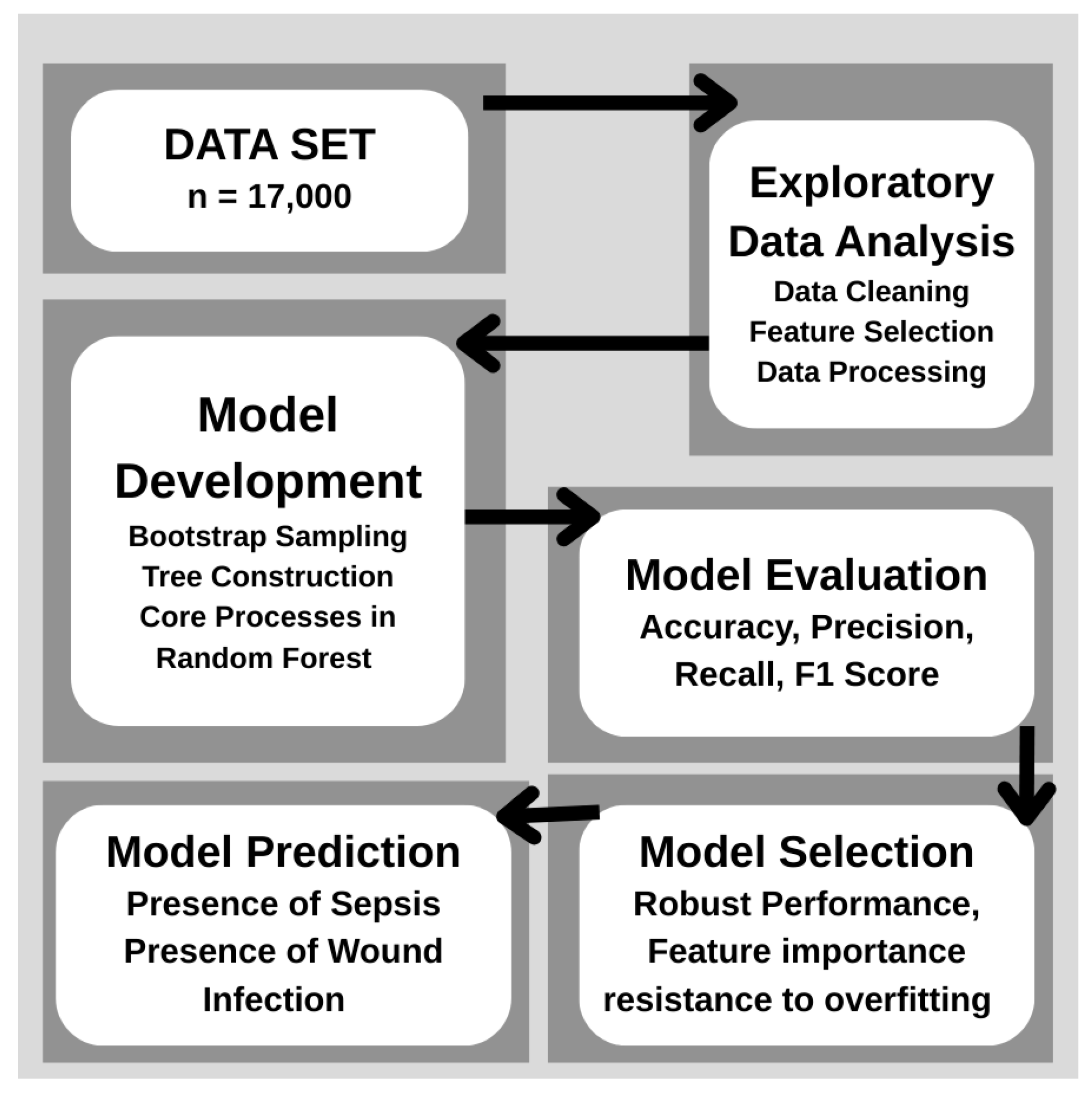 After comparative analysis with other algorithms, including logistic regression, support vector machines, and neural networks, we selected the random forest classifier. This choice was driven by its capability to handle complex data interactions, provide feature-importance insights, and resist overfitting. The random forest model outperformed others in terms of accuracy, precision, and recall for predicting postoperative complications, such as wound infection and sepsis, making it particularly suitable for our objectives.