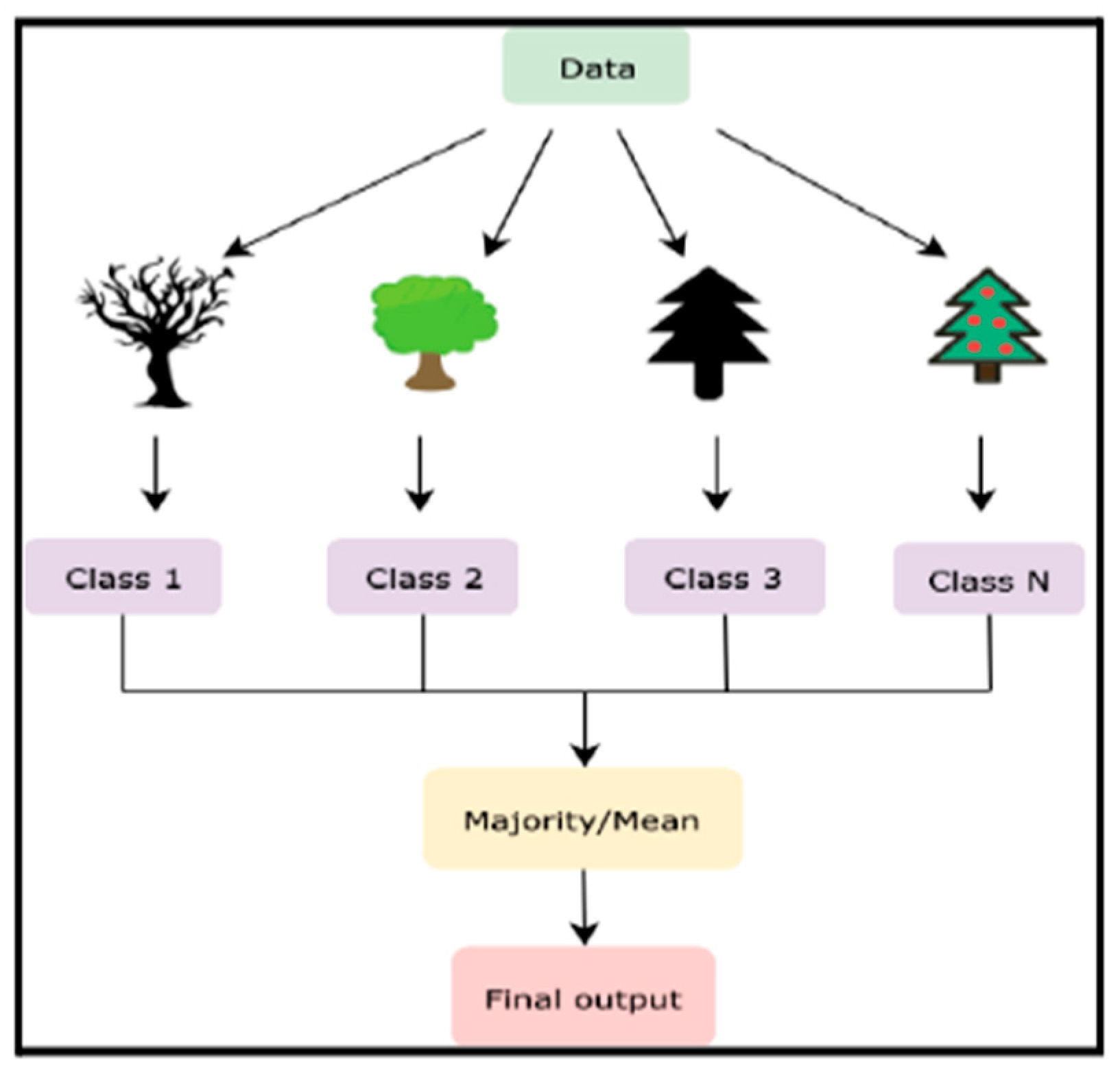 The random forest classifier is a widely used supervised machine learning algorithm for classification and regression tasks. It builds multiple decision trees from different data samples, which collectively improve the model’s accuracy. For classification tasks, the final prediction is made through a majority vote across trees, while for regression tasks, an average of the trees’ outputs is taken. This ensemble technique reduces the likelihood of overfitting and improves the model’s generalization.