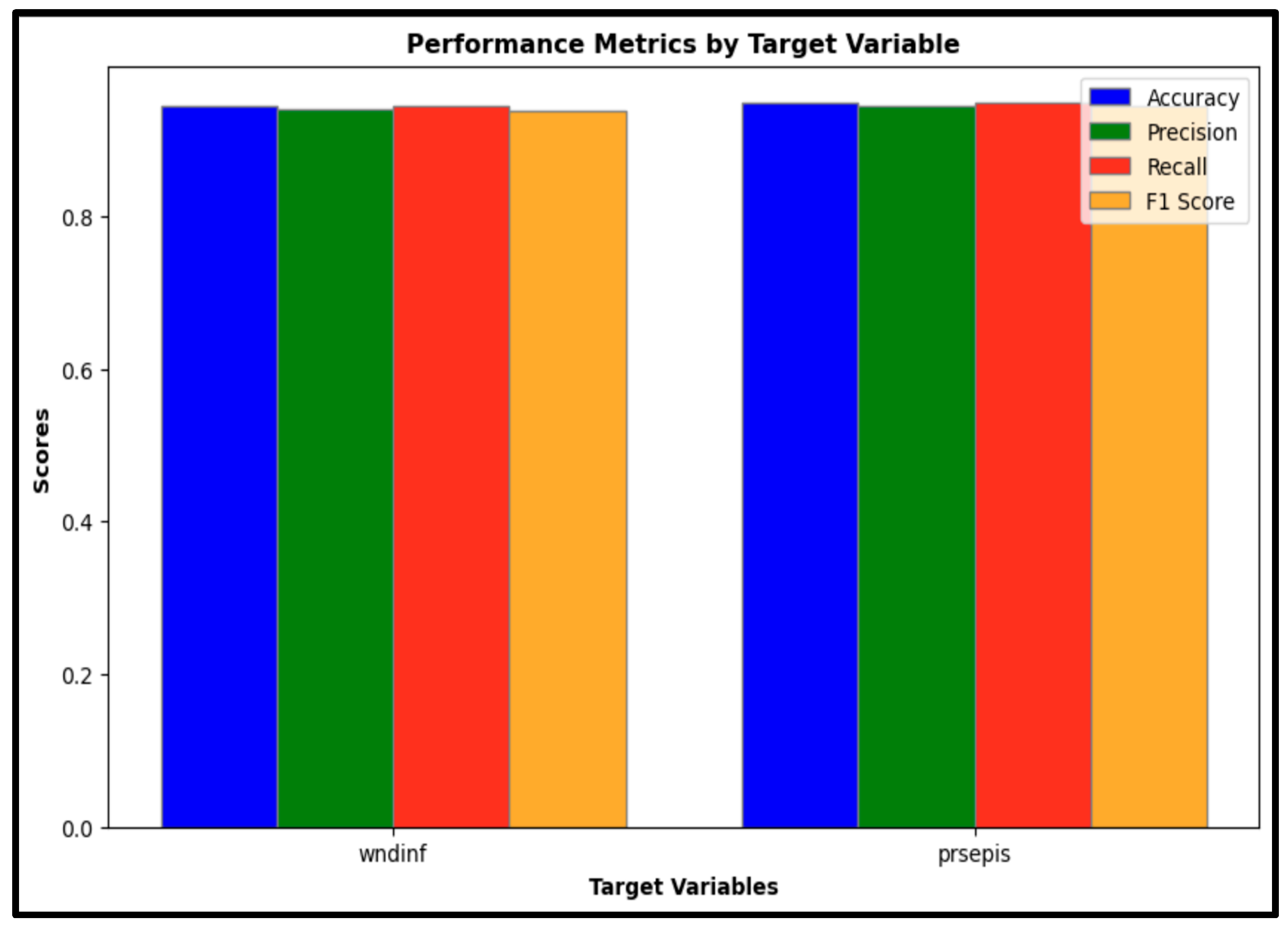 Figure 5 presents a comparative analysis of accuracy, precision, recall, and F1-scores for wound infection (wndinf) and sepsis (prsepis), demonstrating that the model maintains strong classification performance across both outcomes.