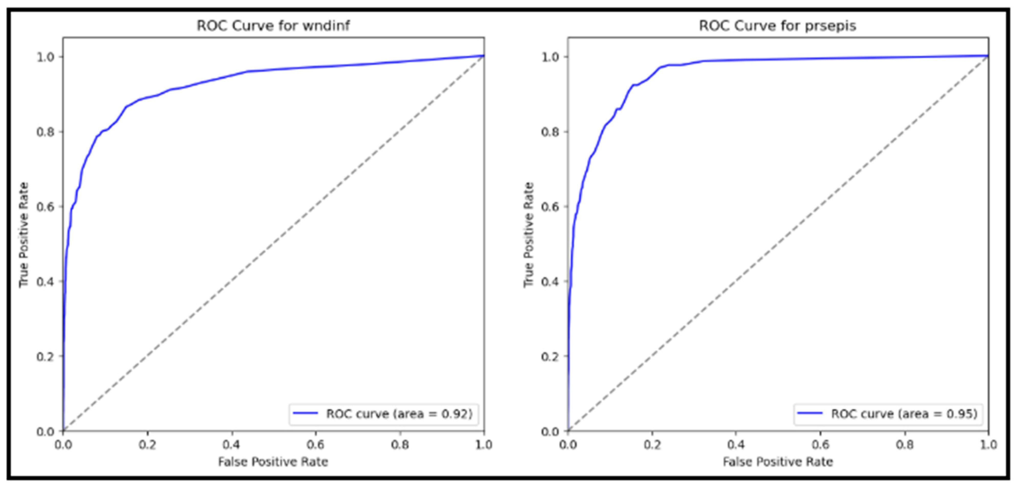 Figure 6. The Area Under the ROC Curve (AUC) scores were 0.92 for wound infection and 0.95 for sepsis. These high AUC values indicate excellent discriminative ability, with both curves approaching the upper left corner of the plot. The ROC-AUC for Wound Infection (wndinf) was 0.92, and the ROC-AUC for Sepsis (prsepis) was 0.95.