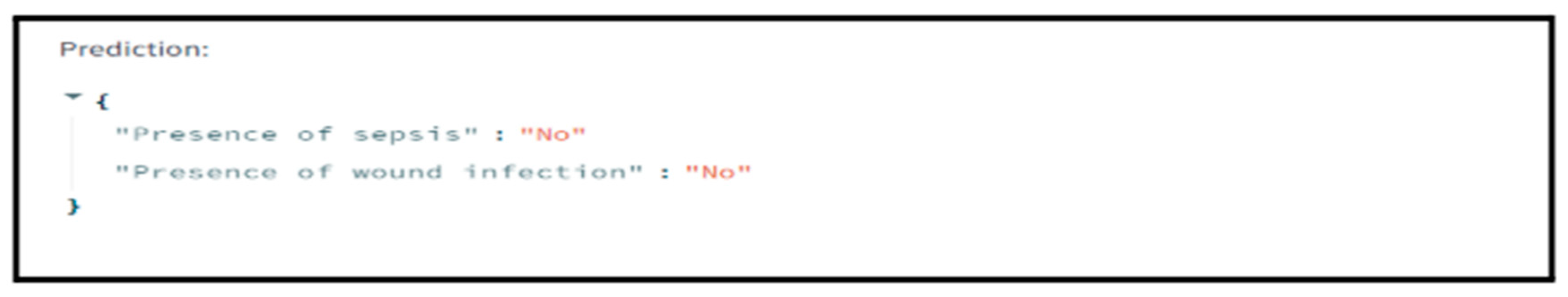 Upon form submission, the application processes the inputs, converts them to the appropriate numerical format, and feeds them into the model. The model generates predictions indicating the likelihood of postoperative complications, specifically sepsis and wound infection. These predictions are then translated into clear, user-friendly messages for the end user.