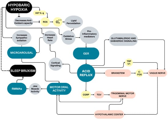 Molecular interactions between GER and neural pathways highlight the complex biochemical environment contributing to SB episodes. GER, which may be aggravated under hypoxic conditions, can trigger a brainstem-mediated protective sequence known as the “triple event model”, consisting of acid reflux, cortical arousal, and rhythmic masticatory muscle activity. Hypoxia-inducible factors (HIFs), nociceptive receptors, and neuropeptides contribute to neuroplastic changes and increased orofacial motor responses. While further studies are warranted, the current evidence supports a plausible link between hypobaric hypoxia and increased SB activity, emphasizing the need for integrated diagnostic approaches and targeted preventive strategies, particularly for individuals exposed to high-altitude environments.