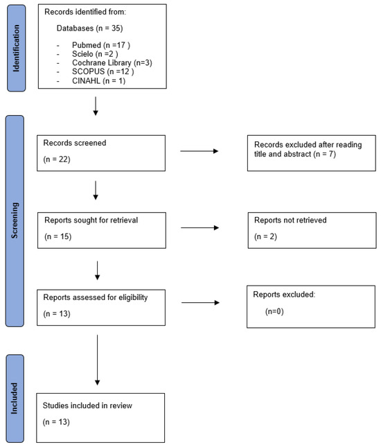 The literature search was conducted in the following databases: Scopus, PubMed, CINAHL, SciELO, and Cochrane Library. A manual search was also performed by examining the reference lists of identified studies to find other relevant articles.