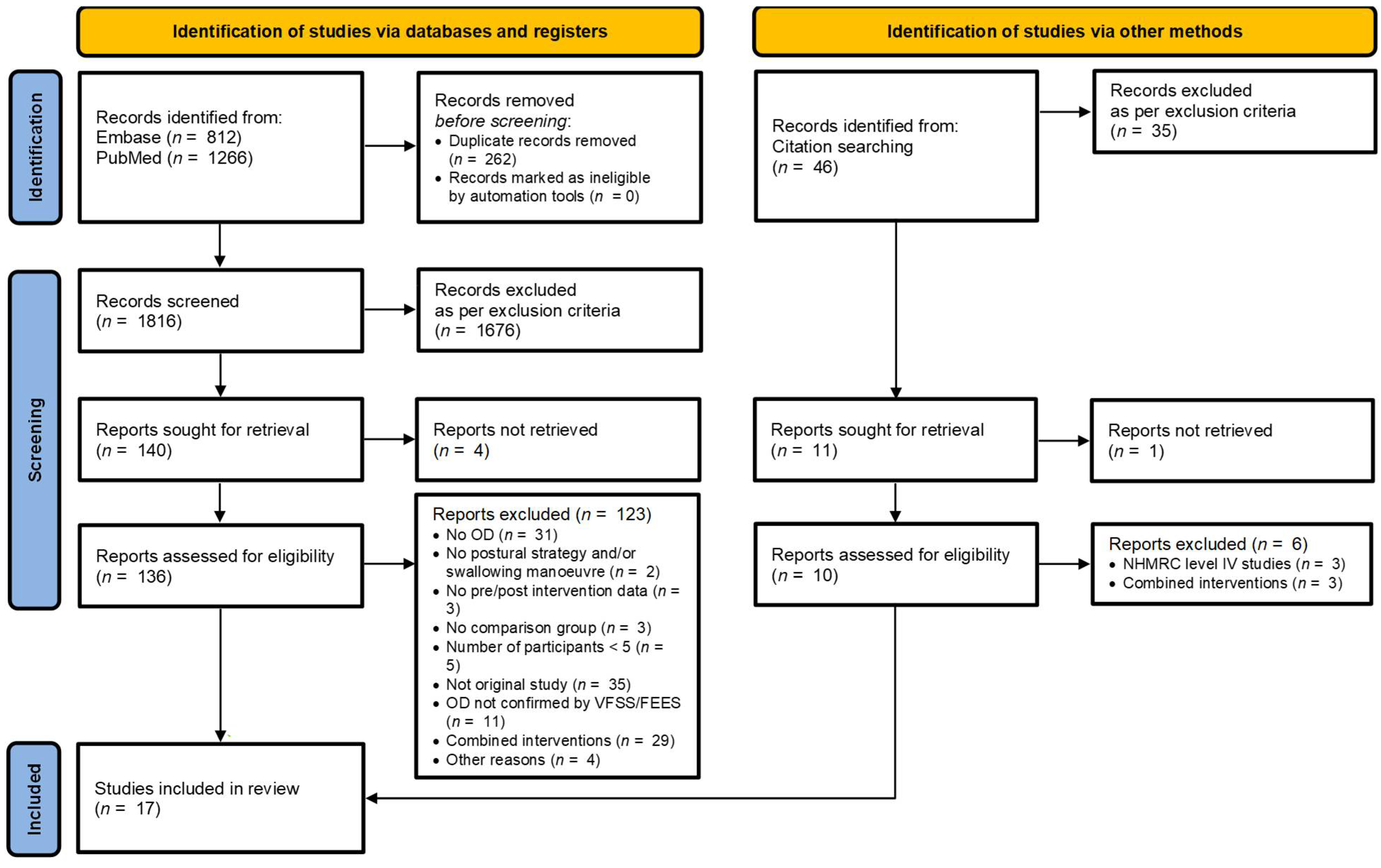 | Embase: (swallowing/ OR dysphagia/) AND (chin tuck OR chin-tuck OR chin down OR chin-down OR head flexion OR neck flexion OR head tilt forward OR head tilt OR flexion of the head OR head rotation OR head-rotation OR head turn OR rotation of the head OR rotated head OR head back OR chin up OR head extension OR extension of the head OR head tilt OR tilting head OR side-lying OR side lying OR Mendelsohn OR supraglottic swallow OR voluntary airway closure OR airway closure technique OR airway protection technique OR airway protection maneuver OR airway protection manoeuvre OR breath-holding OR breath holding OR supersupraglottic swallow OR super-supraglottic swallow OR super supraglottic swallow OR effortful swallow OR hard swallow OR Masako OR Tongue holding OR tongue-holding OR tongue hold OR tongue-hold OR Shaker OR head lift) |