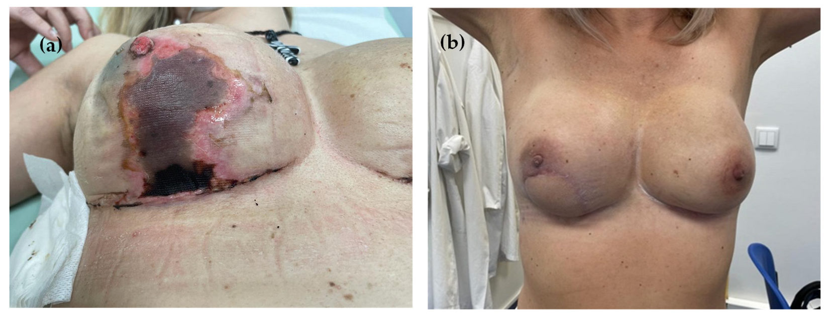 - Costeira, B.; da Silva, F.B.; Oom, R.; Costa, C.; Moniz, J.V.; Abecasis, N.; Santos, C.R. Locoregional recurrence in skin-sparing and nipple-sparing mastectomies. J. Surg. Oncol. 2022, 125, 352–360. [Google Scholar] [CrossRef]