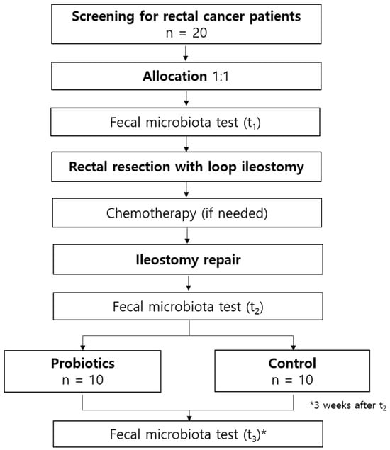 Chicago/Turabian StylePark, Hyeung-min, Jaram Lee, Soo Young Lee, Chang Hyun Kim, and Hyeong Rok Kim. 2025. "Changes in Gut Microbiome According to Probiotic Intake in Rectal Cancer Patients Undergoing Diverting Stoma Repair: Study Protocol" Journal of Clinical Medicine 14, no. 20: 7190. https://doi.org/10.3390/jcm14207190