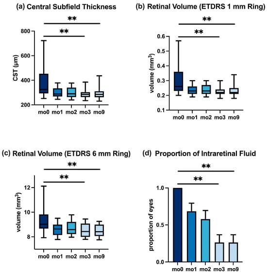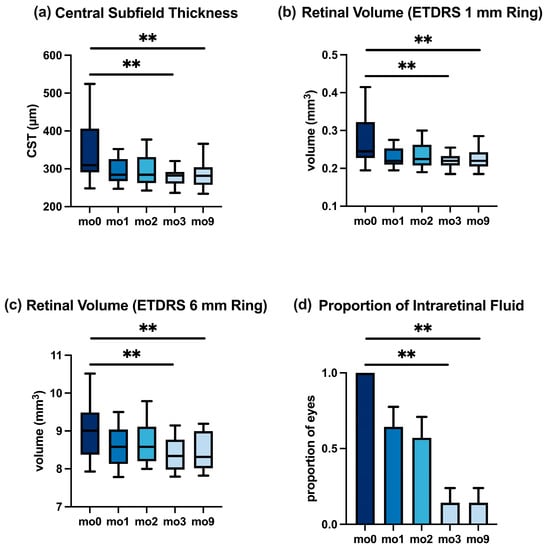 | BCVA  (logMAR)  | IOP (mmHg) | CST (µm) | Volume: ETDRS 1 mm (mm3) | Volume: ETDRS 6 mm (mm3) | IRF (Proportion of Eyes %) | |