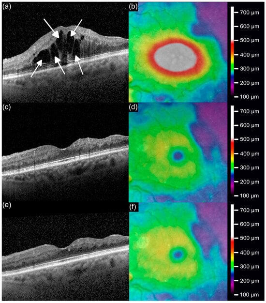 - Hikichi, T.; Kurabe, H.; Notoya, A.; Oguro, Y.; Hirano, M.; Doi, Y. Short-term outcomes of switching to faricimab for macular edema secondary to retinal vein occlusion. Jpn. J. Ophthalmol. 2025; Online ahead of print. [Google Scholar] [CrossRef]