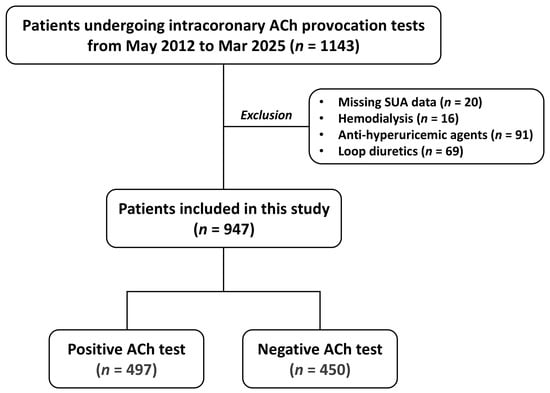 This single-center study was performed in a retrospective manner at Chiba University Hospital, Japan. From May 2012 to March 2025, a total of 1143 patients underwent intracoronary ACh provocation testing for the diagnosis of VSA. Major exclusion criteria included missing SUA data, maintenance hemodialysis, and medication with anti-hyperuricemic agents and loop diuretics (Figure 1). Thus, a total of 947 patients were included in the current analysis (Figure 1). Cardiovascular risk factors, including hypertension, diabetes, dyslipidemia, and current smoking, were defined based on the Japanese Association of Cardiovascular Intervention and Therapeutics criteria [12]. Hypertension was defined as a prior diagnosis of hypertension or prior antihypertensive treatments, or newly diagnosed hypertension during the hospitalization with systolic blood pressure ≥ 140 mmHg or diastolic blood pressure ≥ 90 mmHg. Diabetes was defined as a prior diagnosis of diabetes or prior glucose-lowering treatments, or glycated hemoglobin ≥ 6.5% during the hospitalization. Dyslipidemia was defined as low-density lipoprotein cholesterol ≥ 140 mg/dL, high-density lipoprotein cholesterol < 40 mg/dL, triglycerides > 150 mg/dL, or a prior diagnosis of dyslipidemia. Low- and high-density lipoprotein cholesterol levels were evaluated in a fasting or non-fasting condition. Other laboratory data, such as hemoglobin and creatinine, were also evaluated. In addition, patients with a history of smoking within one year were defined as current smokers. The triglyceride/high-density lipoprotein cholesterol ratio, a risk marker of cardiometabolic health [13], was calculated with levels of triglyceride divided by high-density lipoprotein cholesterol. This study was conducted in accordance with the Declaration of Helsinki, and the ethics committee of Chiba University Graduate School of Medicine approved the present study. Informed consent was obtained in an opt-out fashion.