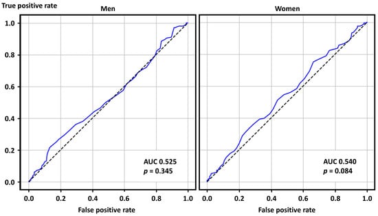 Receiver operating characteristics curve analysis for positive acetylcholine provocation tests in men and women. AUC—area under the curve.