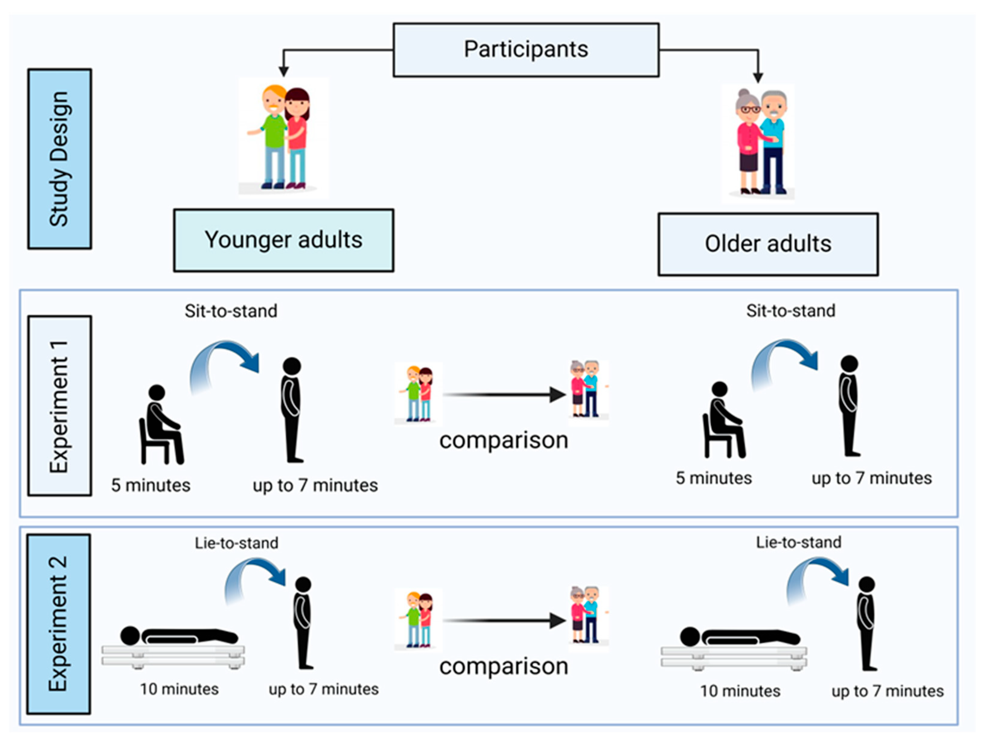 - Vargas, E. Physiological Responses To Postural Change Young And Old Healthy Individuals In The Sydrome of Postural Hypotension Increases in Incidence with Increasing Age so That up to 20070 of Old People Suffer from the Syndrome. Exp. Gerontol. 1983, 17, 445–451. [Google Scholar] [CrossRef]