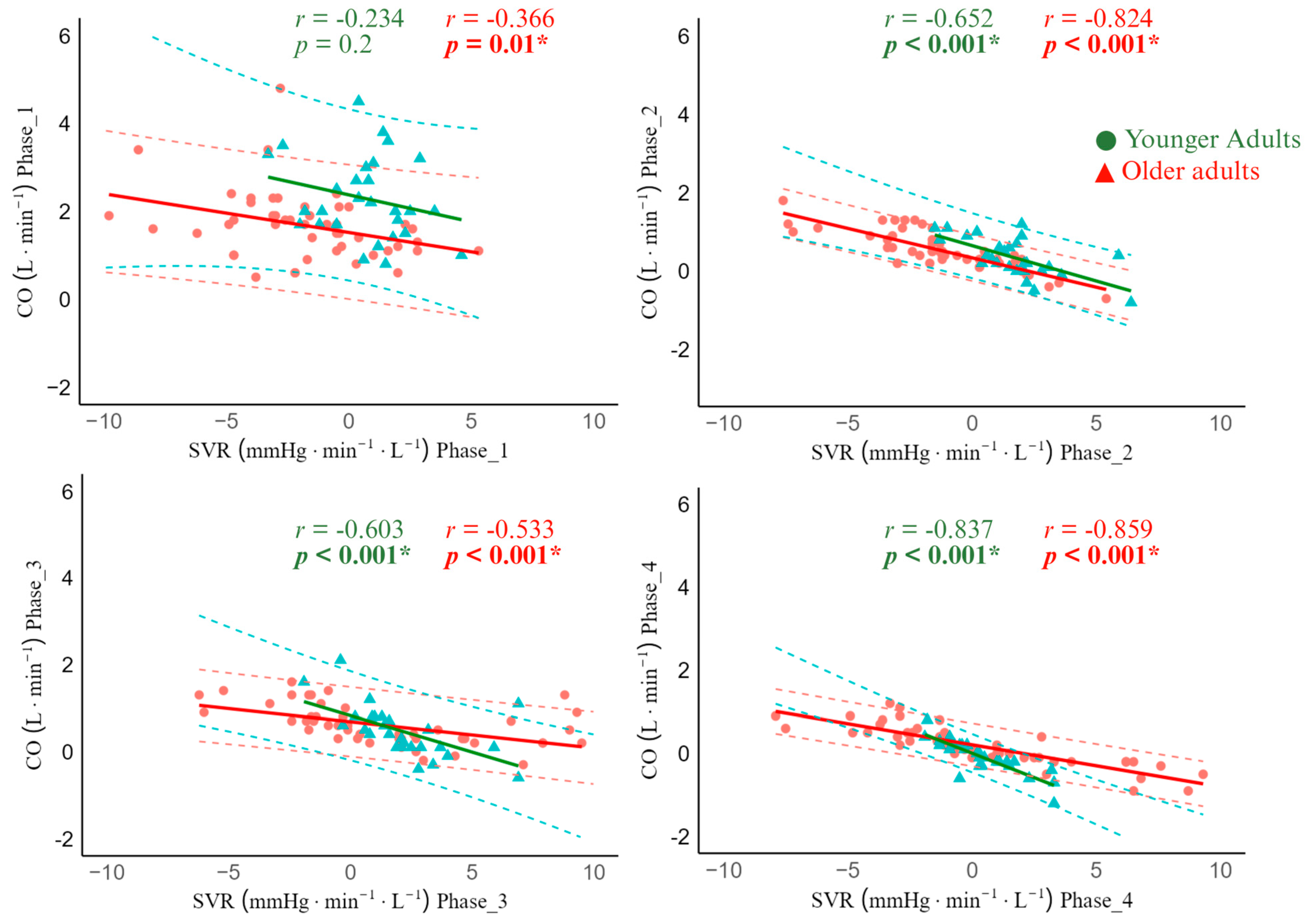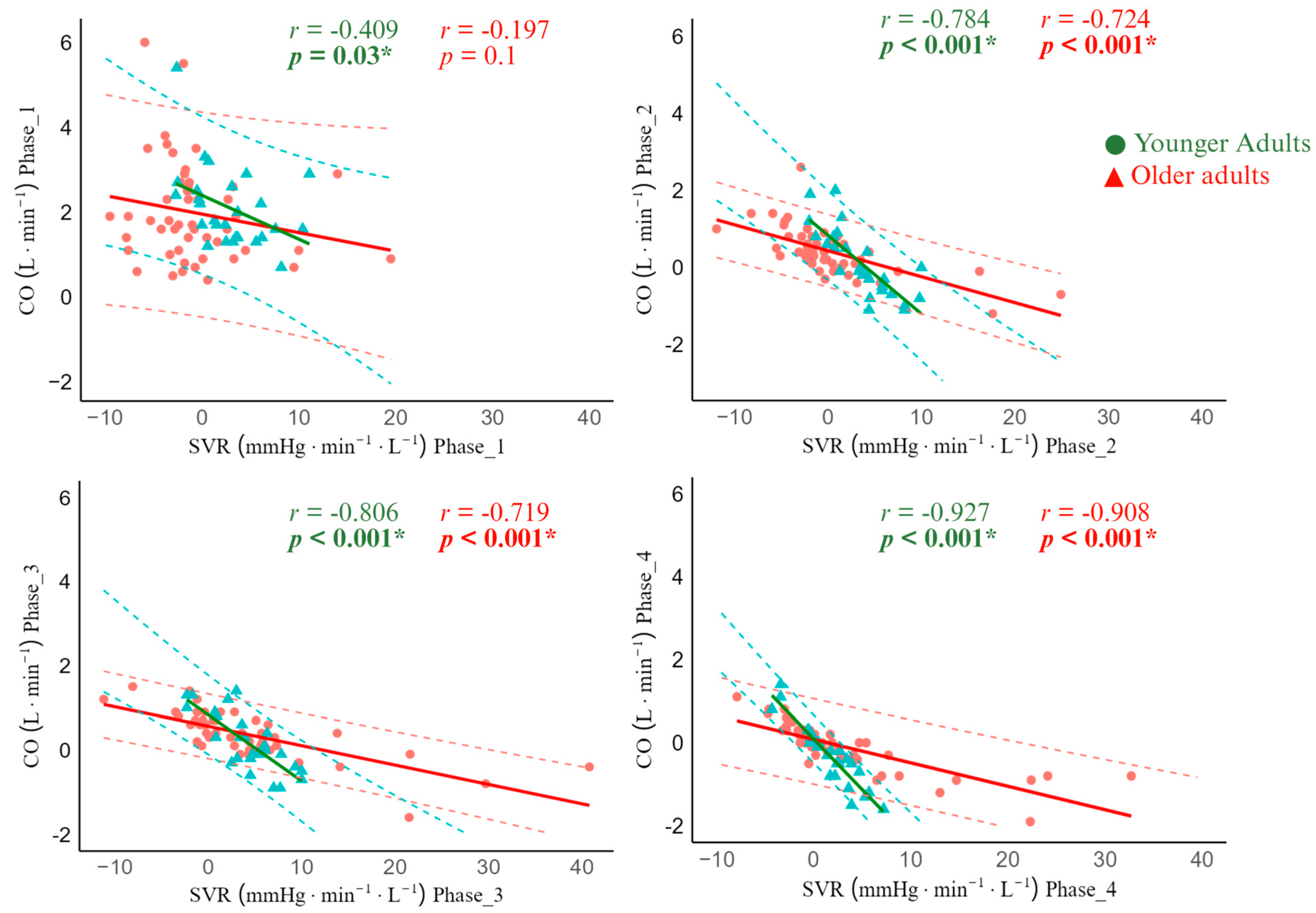 SVR (mmHg·min−1·L−1) | Younger adults | 19.4 ± 3.6 (18.0; 20.9) | −6.4|3.2 (3.1; 2.3) | 2.4|4.9 (−2.7; 11.0) | 3.6|4.8 (−2.0; 10.0) | 4.4|3.9 (−2.3; 10.0) | 1.7|3.7 (−4.3; 7.2) |
