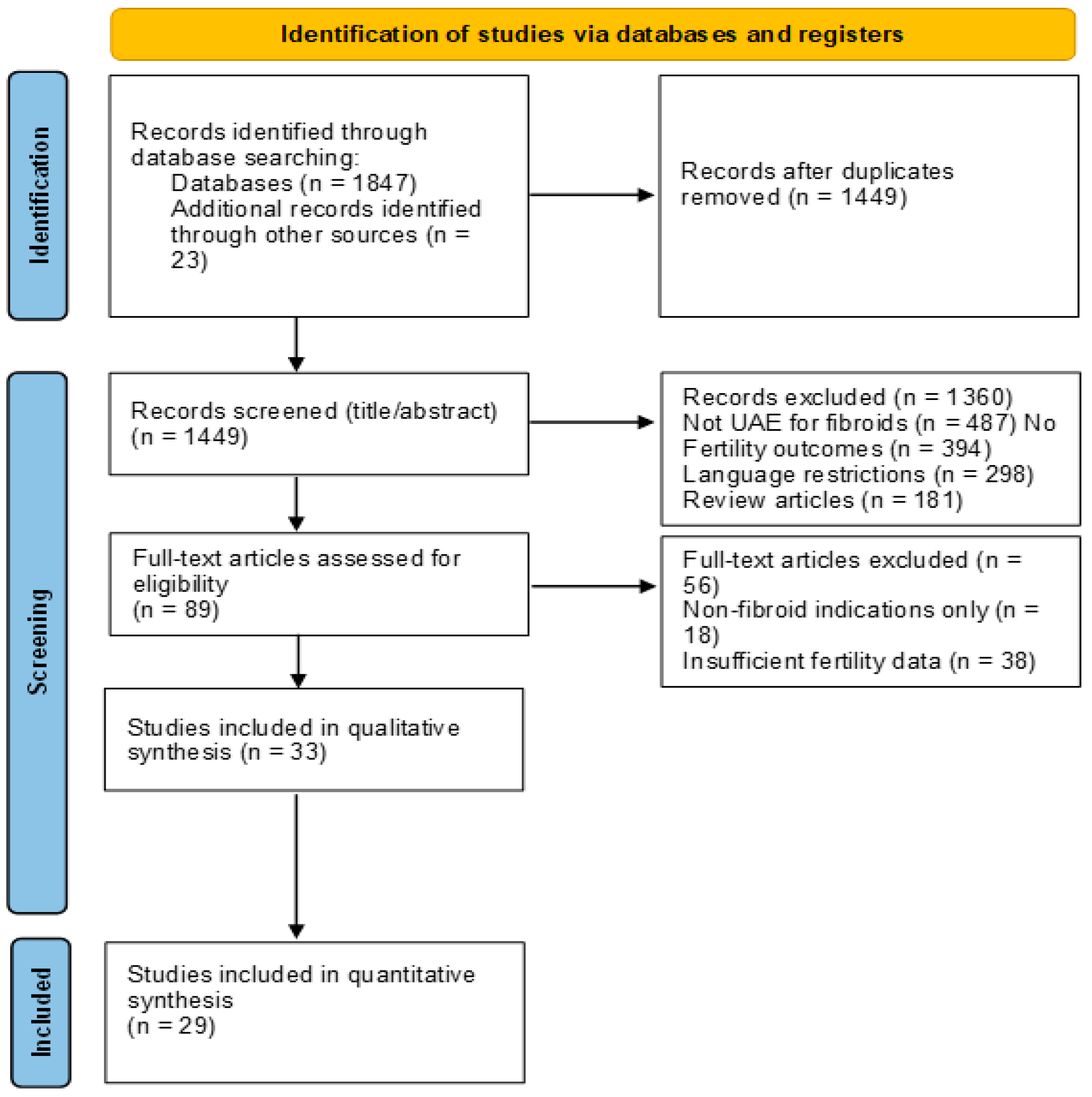 - Third: “Which patient, procedure, and related factors affect post-UAE reproductive success [21,22]?” Identifying predictive factors of positive fertility results will promote personalized treatment suggestions and optimal patient choice. The analysis will check how variables like age, fibroid characteristics, embolization technique, and selection of embolic agent affect the reproductive outcome later.