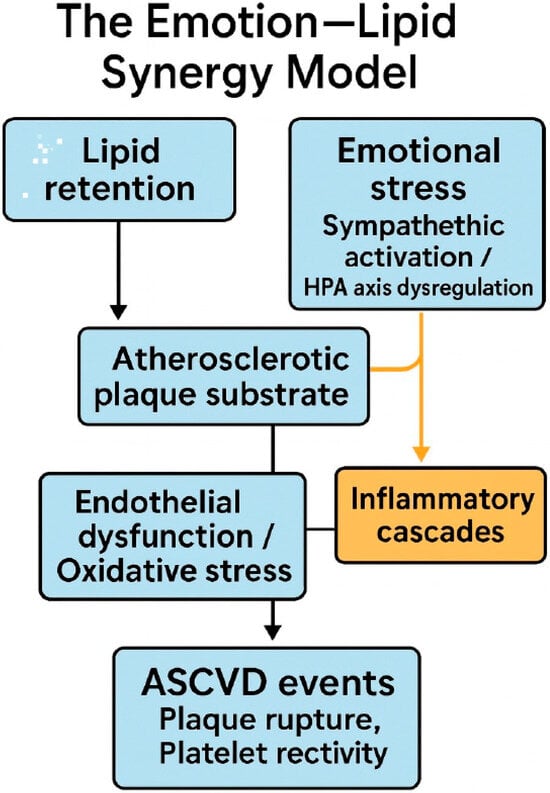 Taken together, these findings point to an urgent need for integrative paradigms that address both lipid-driven and emotion-driven pathobiological pathways in cardiovascular disease. In response, we propose the Emotion–Lipid Synergy Model, a conceptual framework that situates emotional stress not as an ancillary variable, but as a central, co-equal determinant in the genesis and progression of atherosclerotic cardiovascular disease. This model underscores how emotional stress potentiates lipid-mediated injury—via inflammatory amplification, endothelial dysfunction, autonomic imbalance, and microvascular reactivity—creating a synergistic effect that magnifies residual risk even when lipid targets are met. What sets the Emotion–Lipid Synergy Model apart from existing biopsychosocial frameworks is its explicit focus on the biological crosstalk between lipid burden and stress-response pathways. Whereas traditional models treat psychosocial stress as a contextual factor, our model emphasizes its role as a biological amplifier of lipid-driven atherothrombosis—through neuroendocrine activation, NLRP3 inflammasome signaling, oxidative stress, and endothelial dysfunction [,,,,,]. The model is therefore designed with three complementary aims: (i) to provide a mechanistic framework that integrates lipid biology with emotional stress physiology; (ii) to enhance risk stratification by identifying subgroups whose lipid-related risk is magnified by stress reactivity; and (iii) to guide clinical intervention design, offering a conceptual scaffold for combining lipid-lowering therapies with stress-targeted strategies such as cognitive-behavioral interventions, mindfulness, or pharmacological modulation. By framing stress as a co-equal determinant rather than a peripheral modifier, this model introduces a novel paradigm for precision cardiovascular prevention. Beyond acknowledging psychosocial risk, the model’s novelty lies in specifying the lipid-specific crosstalk with stress biology—for example, stress-triggered NLRP3 inflammasome activation and oxidative stress that converge on endothelial dysfunction to amplify lipid-driven atherothrombosis [,]. This mechanistic emphasis distinguishes the framework as a biological amplifier model rather than a contextual reframing.