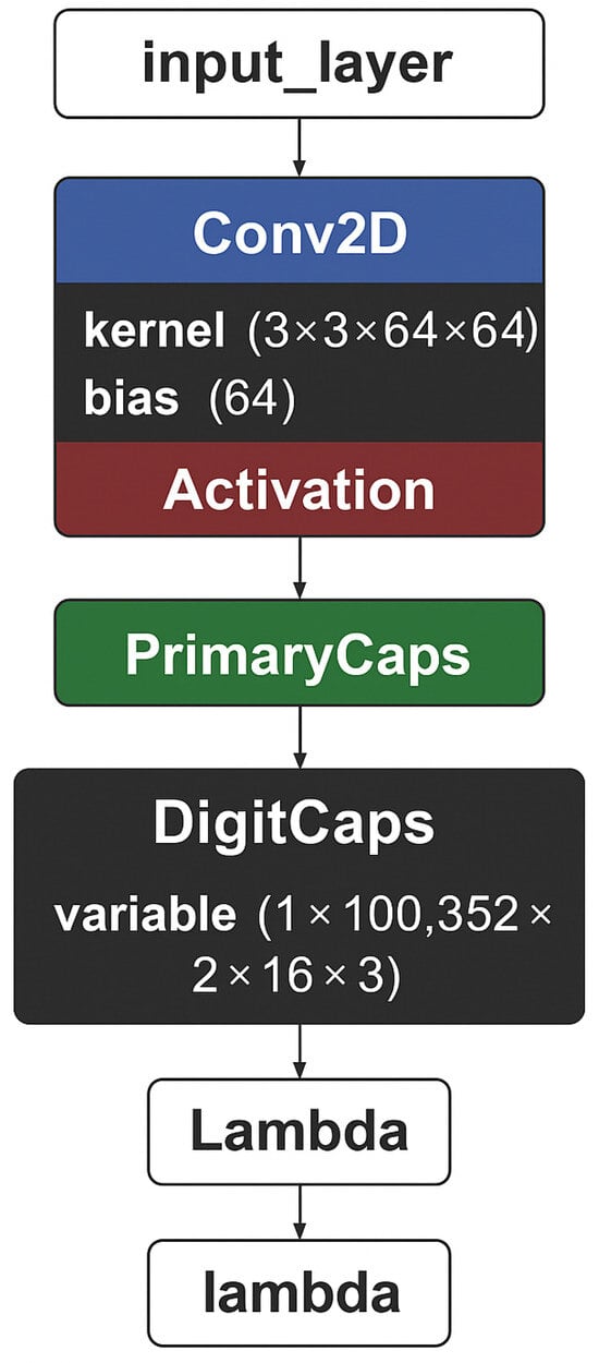 Before implementing the model, analysis and design procedures were performed to guide the selection of appropriate layers and hyperparameters. Chest X-ray images exhibit a significant brightness variation and slight differences between pathologic and nonpathologic tissues. While CNNs are efficient in learning local features, they fail to preserve orientation and spatial relationships. For this reason, a CapsNet-based architecture was chosen, where capsules have the capability to encode the existence and geometric properties of features. The model begins with a convolutional block with ReLU activation and pooling that is responsible for capturing low-level feature maps such as textures and edges. The outputs of this are fed to the PrimaryCaps layer, which encodes local information into eight-dimensional vectors. With stride 2, the spatial resolution becomes downsampled to 56 × 56, and 32 capsules with channels offer a dense feature representation. The DigitCaps layer dynamically routes, which produces two 16-dimensional output capsules for the Normal and Pneumonia classes. It makes three iterations to strengthen stable connections between lower- and higher-level capsules. Consistent with [], we used three routing iterations as an empirically validated compromise between convergence stability, accuracy, and computational efficiency. For training, the margin loss function was used using the 0.9 and 0.1 threshold and the balance factor so that the lengths of the capsules represent the probabilities of classes. This configuration follows the original formulation in [], where the parameters were empirically validated as an effective balance between promoting the activation of the correct class capsule and suppressing incorrect ones. Optimization was performed using Adam optimizer at the learning rate 1 × 10−4 to have stable convergence of routing-based gradients. Implementation within Keras combined standard modular layers with new capsule elements. A nonlinear squash function was defined to normalize capsule vectors without orientational loss as a feature information carrier. The PrimaryCaps layer was employed as a convolution and generated K × dK channels, reshaped into capsules, while DigitCaps employed transformation matrices and iterative routing to output class-level capsules. The final capsule lengths formed the direct classification probabilities, and they offered superior spatial feature representation compared to the traditional CNNs.