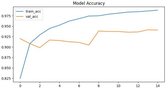 To further evaluate the performance of the proposed neural network, the training process was monitored using accuracy and loss metrics. Figure 6 and Figure 7 illustrate the model’s accuracy and margin loss across training and validation sets over 14 epochs. These plots provide insights into the convergence behavior of the network, the stability of learning, and the degree of generalization to unseen data.