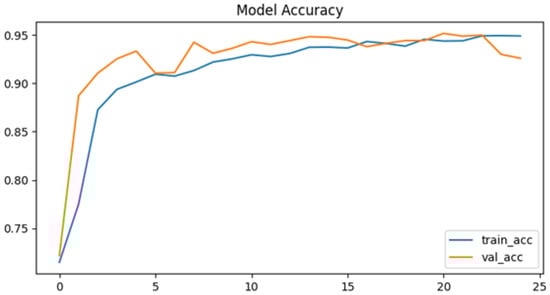 In the accuracy plot (Figure 9), the training and validation curves progress in parallel, indicating stable learning dynamics. Validation accuracy peaks at 95.2%, closely matching training accuracy, which shows that the tuned model avoided significant overfitting. The plateau after epoch 20 highlights convergence.