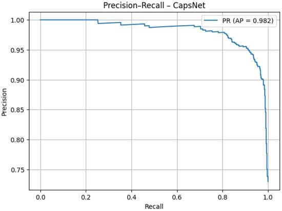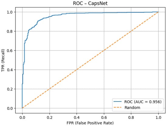 Other CNN-based models typically achieved 92–93% accuracy, 89–91% sensitivity, and 93–94% specificity, demonstrating strong class separation ability but still failing to reach the sensitivity level of the proposed capsule network. In contrast, the presented model achieved the highest accuracy (95%) and sensitivity (98.7%), albeit at the expense of reduced specificity (by 8–9 percentage points). This trade-off is justifiable in clinical practice, as the minimization of false negatives is often the top priority, while false positives can be clarified through additional diagnostic examinations.