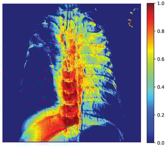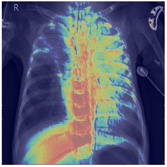 Figure 13 displays the raw activation map (range 0–1), where warmer colors indicate a stronger contribution to the decision. Figure 14 shows the same heatmap superimposed on the original radiograph, aiding anatomical interpretation. The strongest activations are located within the pulmonary fields, particularly around the hila and medial inferior lung zones, with weaker scattered responses along the spine and ribs. This distribution suggests that CapsNet primarily relies on parenchymal density patterns and textural inhomogeneities consistent with the target pathology, whereas extrapulmonary highlights may reflect exposure or contrast effects, osseous contours, or device-related artifacts (e.g., leads, electrodes).
