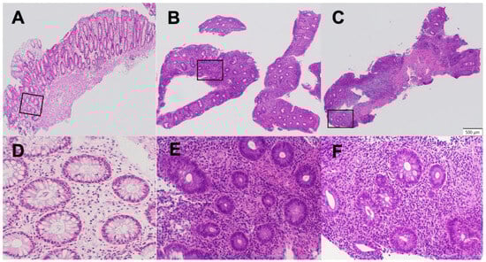 Assessment of Geboes score Grade 3. The percentage of crypts with neutrophilic infiltration was calculated as the number of crypts with neutrophilic infiltration/the total number of crypts on a glass slide, and the black frame indicates the high resolution area. This was used to subclassify the Geboes score Grade 3 into Grades 3.1 3/132 = 2.3% ((A) low resolution; (D) high resolution), Grades 3.2 22/125 = 17.6% ((B) low resolution; (E) high resolution), and Grades 3.3 25/36 = 69.4% ((C) low resolution; (F) high resolution).