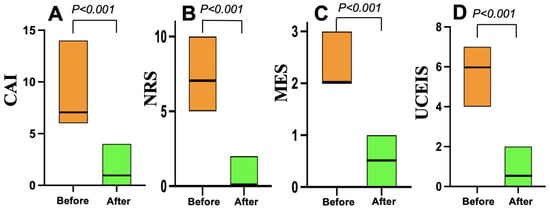 Changes in clinical and endoscopic scores before and after mirikizumab treatment in the Geboes Grade ≥ 3.2 group (n = 22). (A) The clinical activity index (CAI) scores. (B) The numeric rating scale (NRS) for bowel urgency values. (C) The Mayo endoscopic subscore (MES) data. (D) The Ulcerative Colitis Endoscopic Index of Severity (UCEIS) scores.