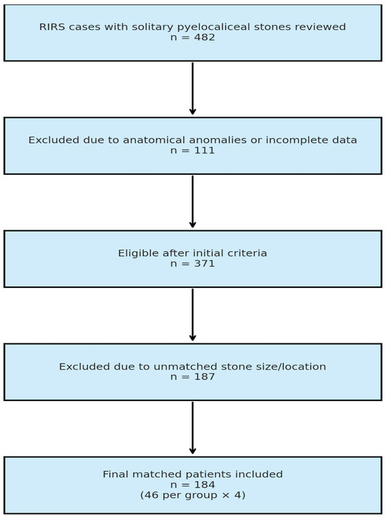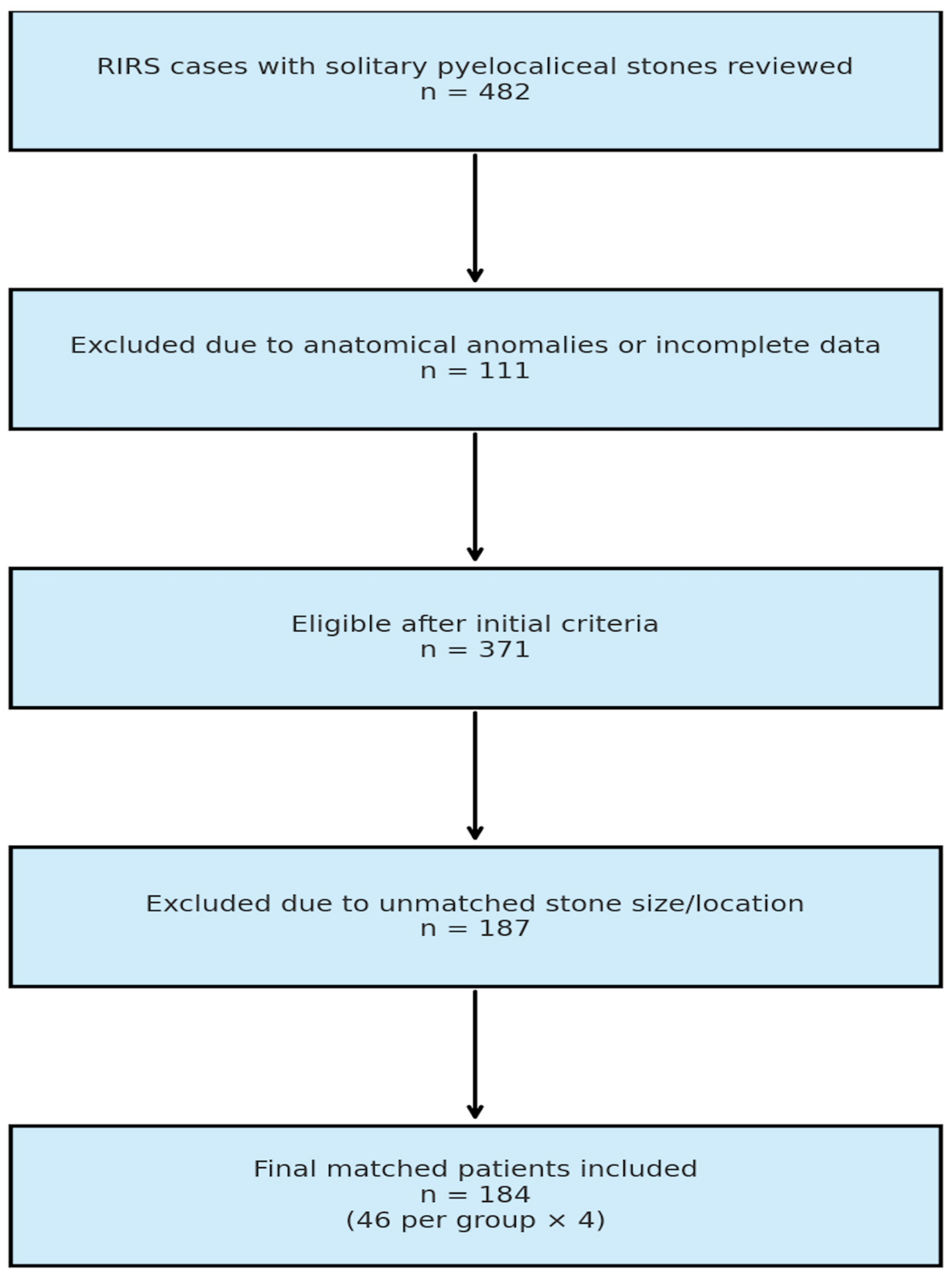 A total of 482 cases with single pyelocaliceal stones were reviewed, and after applying the initial inclusion and exclusion criteria, 371 patients remained eligible. From this cohort, 187 additional patients were excluded due to unmatched stone size and location, resulting in 184 patients selected via 1:1:1:1 manual matching. These were evenly distributed in the four study groups (n = 46 per group) (Figure 1).
