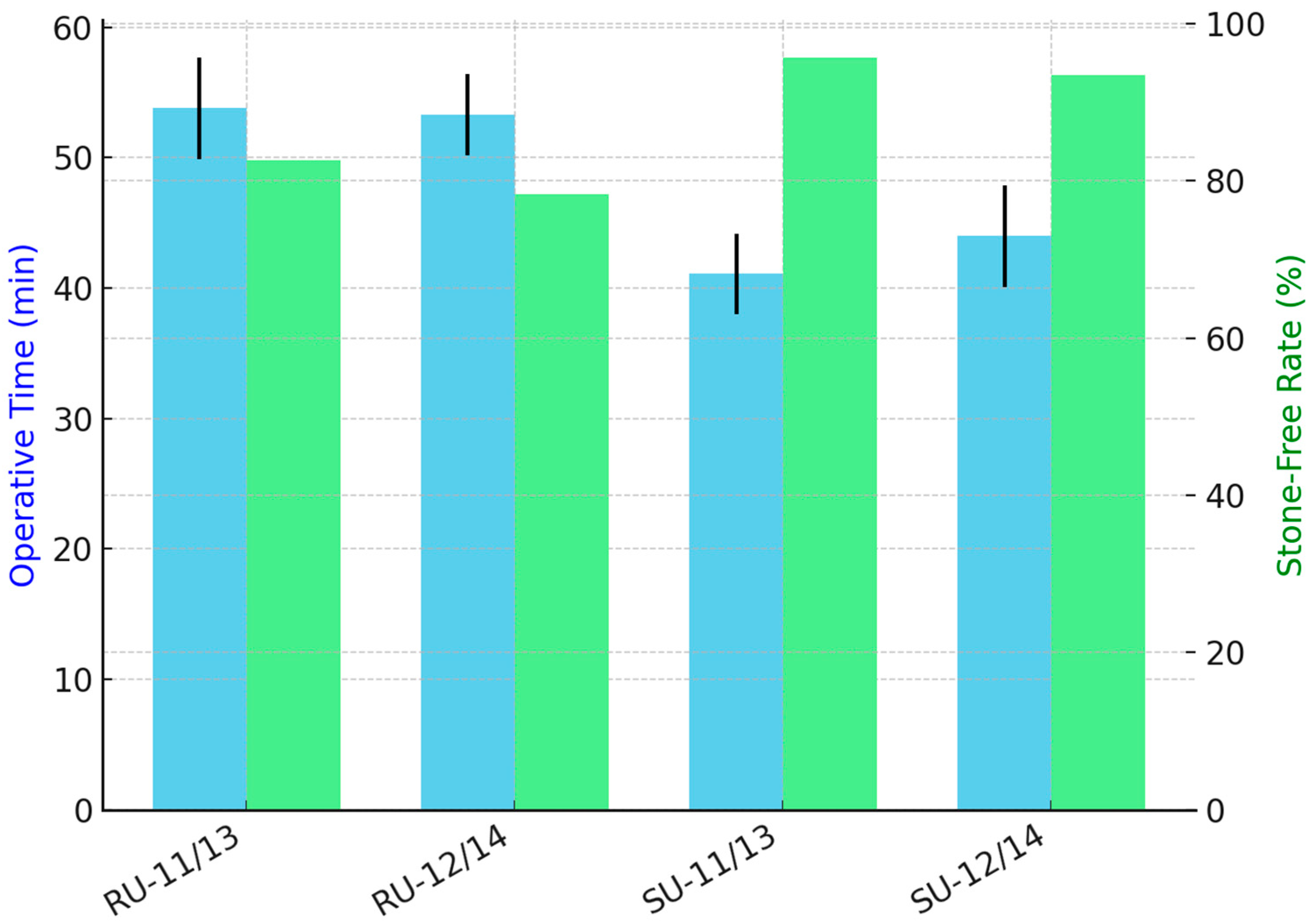 Figure 3. Operative time (minutes, blue bars) and stone-free rate (%, green bars) across the four groups. Black bars represent standard deviation for operative time.