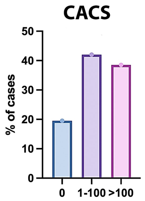 The Coronary Artery Calcium Score was assessed in 200 participants. The mean (±SD) score was 143.87 ± 144.42, with a median (IQR) of 77 (16.75–286.75) and a range of 0 to 425. Regarding the distribution, 39 participants (19.5%) had a score of 0, 84 participants (42%) had scores ranging from 1 to 100, and 77 participants (38.5%) had scores greater than 100 (Figure 2).