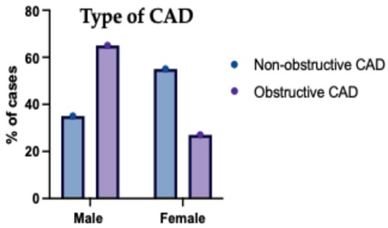Cardiovascular disease (CVD), particularly (CAD), remains a leading cause of morbidity and mortality worldwide, posing a substantial burden on both men and women []. Coronary artery disease is a multifactorial condition and is one of the leading causes of death in the world []. In 2022 alone, coronary heart disease accounted for over 370,000 deaths in the United States, highlighting its continued significance as a public health crisis [,]. Although traditionally perceived as a predominantly male disease, CAD is equally critical in women, who often present with different symptom profiles and experience higher rates of misdiagnosis and adverse outcomes []. This gender disparity is partially due to gaps in awareness, risk stratification, and the interpretation of clinical presentation across sexes.