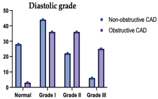 Diastolic Grade of the Studied Groups Regarding the Type of CAD. This bar chart compares the distribution of diastolic dysfunction grades (I, II, III) between patients with non-obstructive CAD and those with obstructive CAD. Grade I diastolic dysfunction was more prevalent among patients with non-obstructive CAD, whereas Grade III predominated among those with obstructive CAD, indicating that obstructive lesions are associated with more severe diastolic impairment. Grade II dysfunction occurred in both groups but was more frequent among patients with obstructive disease. These findings suggest that the presence of obstructive coronary lesions is associated with a progressive worsening of diastolic function.