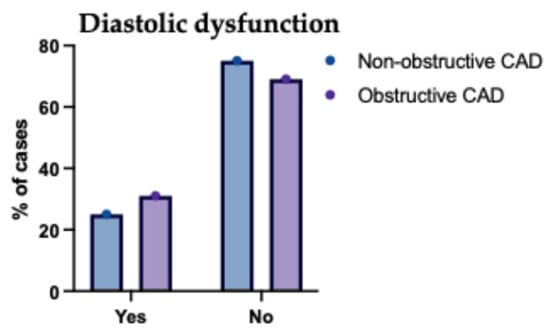 Hypertension and diabetes mellitus were significantly more prevalent in patients with obstructive CAD (p < 0.001) and also in those with diastolic dysfunction (p < 0.001) in our study. This confirms the well-known association of these risk factors with both advanced atherosclerosis and impaired diastolic function []. The strong link between these conditions and DD is further supported by [], who demonstrated in a community cohort that hypertension and diabetes independently predicted worse diastolic function (higher E/e’), with their coexistence conferring an additive negative impact, potentially explaining the increased risk of heart failure in such patients [,]. While previous studies examining these relationships used older diagnostic criteria or lacked advanced echo techniques [,], our findings, adjusted implicitly through group comparisons, reinforce the crucial role of hypertension and diabetes in the development of both obstructive CAD and diastolic dysfunction.