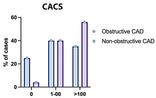 Glycemic control, reflected by HbA1c, was significantly worse in the obstructive CAD group compared to the non-obstructive group (p = 0.002), consistent with studies linking higher HbA1c levels to increased severity and complexity of coronary lesions, even in non-diabetic individuals [,]. However, HbA1c levels did not significantly differ across CACS categories in our analysis (p = 0.903), suggesting that while poor glycemic control is associated with obstructive disease, its relationship with the overall calcified plaque burden might be less direct or influenced by other factors within this specific population.