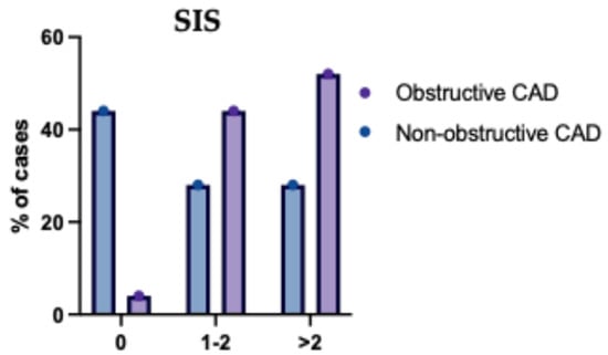 The mean SIS was significantly higher in obstructive CAD compared to non-obstructive CAD (p < 0.001). SIS was significantly different between both groups (p < 0.001); SIS > 2 was significantly higher in obstructive CAD compared to non-obstructive CAD (57.53% vs. 28.35%) (Table 9 and Figure 8).