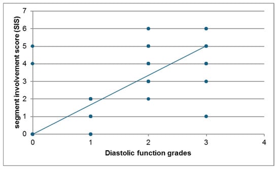 Scatter Plot Demonstrating the Positive Correlation Between Segment Involvement Score (SIS) and Diastolic Function Grades. The scatter plot illustrates a positive linear relationship between SIS and diastolic dysfunction grades, indicating that higher diastolic impairment is associated with greater coronary segment involvement. This trend suggests a potential link between the extent of coronary artery disease and worsening left ventricular diastolic function.