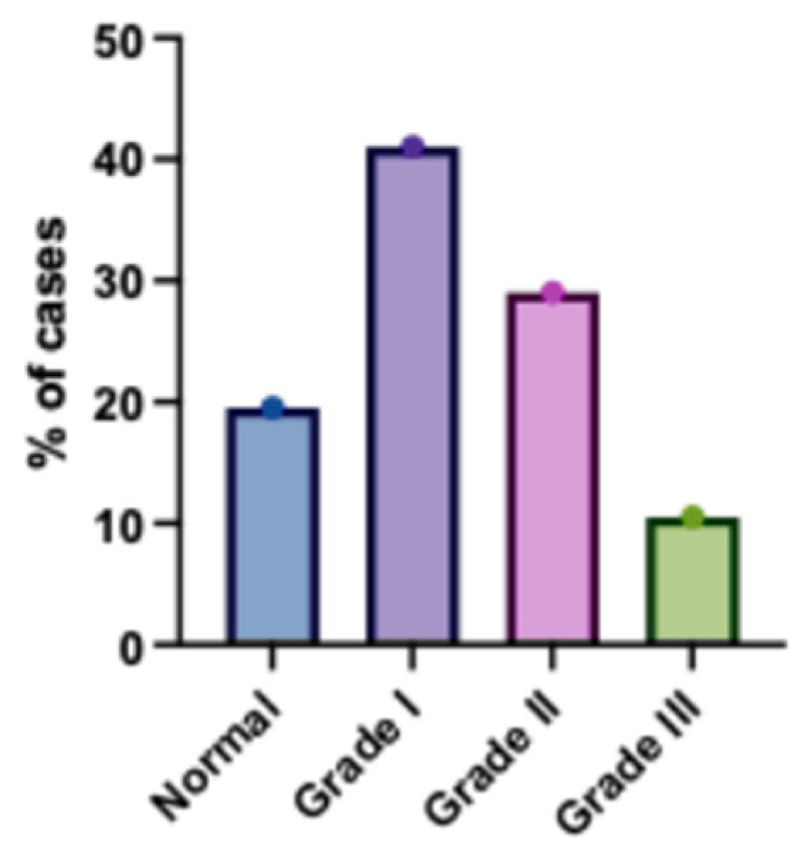Among the studied patients, 39 (19.5%) patients had normal diastolic function, 82 (41%) patients had diastolic dysfunction grade I, 58 (29%) patients had diastolic dysfunction grade II and 21 (10.5%) patients had diastolic grade III (