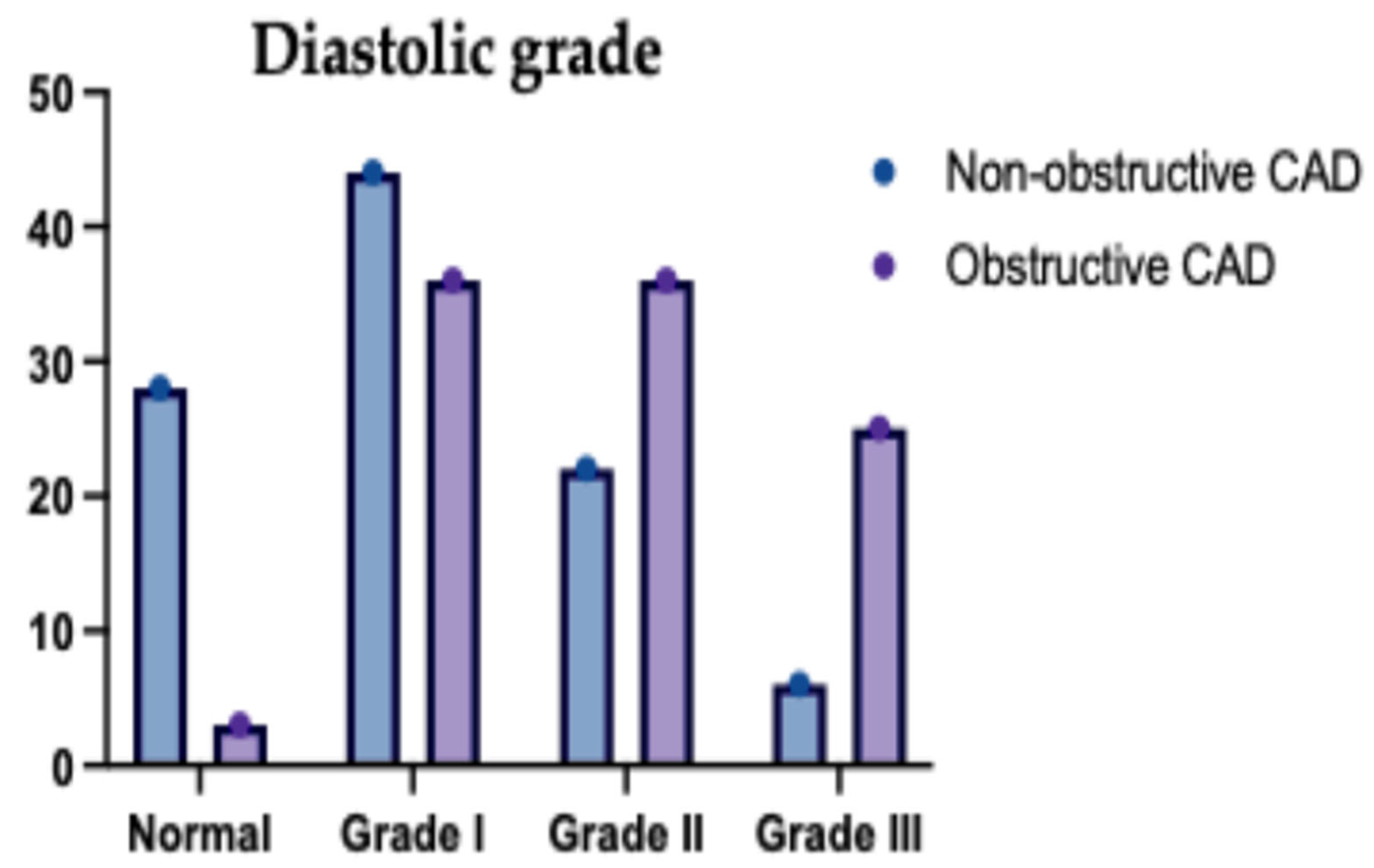 Despite the established impact of overt ischemic heart disease, the relationship between the severity of CAD, particularly in its earlier or non-obstructive stages, and the degree of LV diastolic dysfunction has remained incompletely understood, with limited and sometimes contradictory evidence [